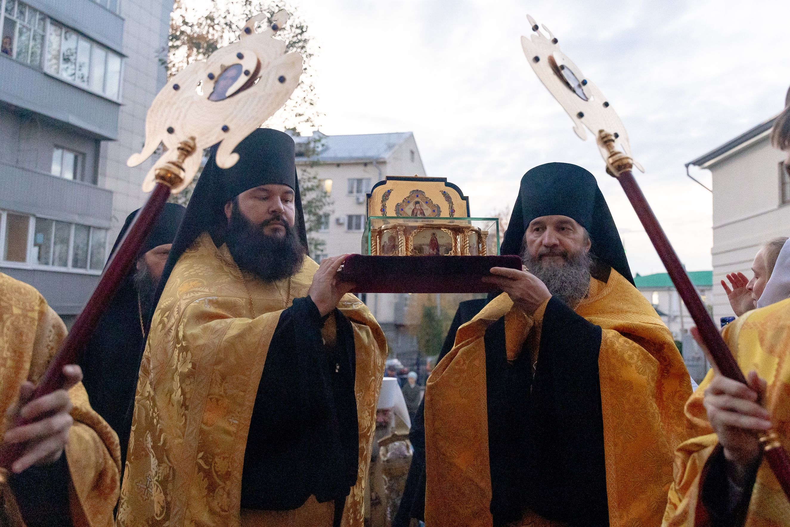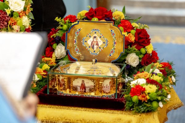 У дверей собора ковчег встретили митрополит Казанский и Татарстанский Кирилл, епископ Рыбинский и Романово-Борисоглебский Вениамин, епископ Чистопольский и Нижнекамский Пахомий, епископ Альметьевский и Бугульминский Мефодий, епископ Сарапульский и Можгинский Павел, епископ Нефтекамский и Белебеевский Митрофан, епископ Набережночелнинский и Елабужский Гавриил, духовенство и верующие Казанской епархии.