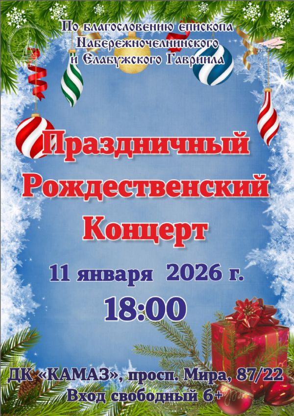 По благословению епископа Набережночелниниского и Елабужского Гавриила, в честь праздника Рождества Христова 11 января в 18.00 во Дворце культуры «КАМАЗ» г. Набережные Челны состоится Рождественский концерт.