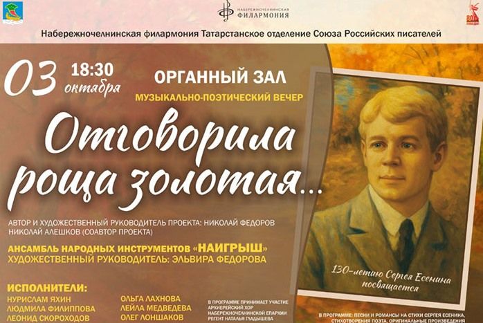 3 октября в 18:30 в Органном зале города Набережные Челны пройдет литературно-музыкальный вечер, посвященный̆ 130-летию со дня рождения великого русского поэта Сергея Александровича Есенина «Отговорила роща золотая». Авторы проекта — Заслуженный деятель искусств Республики Татарстан, поэт Николай Алешков и Николай Федоров, художественный руководитель.