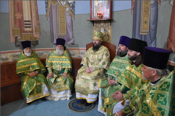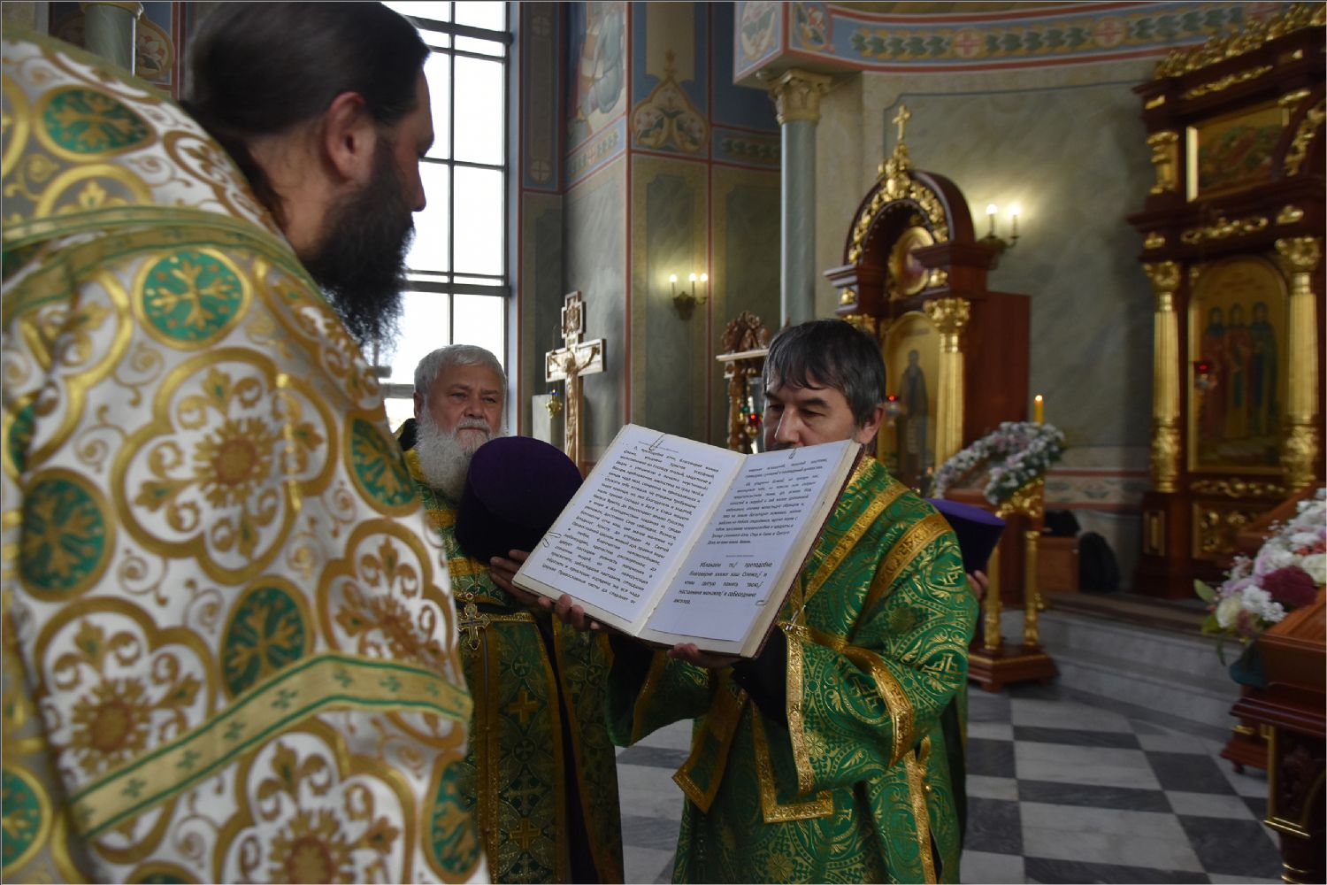 Архипастырю сослужили секретарь Набережночелнинской епархии протоиерей Андрей Лосык, благочинный Закамского округа протоиерей Андрей Дубровин, настоятель храма преподобного Серафима Саровского города Набережные Челны иеромонах Амвросий (Степанюк), клирик прихода протоиерей Сергий Козлов и заштатный клирик Набережночелнинской епархии протоиерей Михаил Гречко. Диаконский чин возглавил протодиакон Дмитрий Половников. Богослужебные песнопения исполнили архиерейский хор под управлением Натальи Гладышевой.