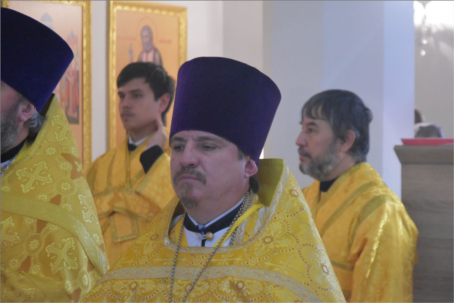 Архиерею сослужили: секретарь Набережночелнинской епархии протоиерей Андрей Лосык, благочинный Закамского округа протоиерей Андрей Дубровин, настоятель храма Воздвижения Креста Господня протоиерей Сергий Писковцев, настоятель храма преподобного Серафима Саровского иеромонах Амвросий (Степанюк). Песнопения исполнил приходской хор под управлением Кристины Матвеевой.