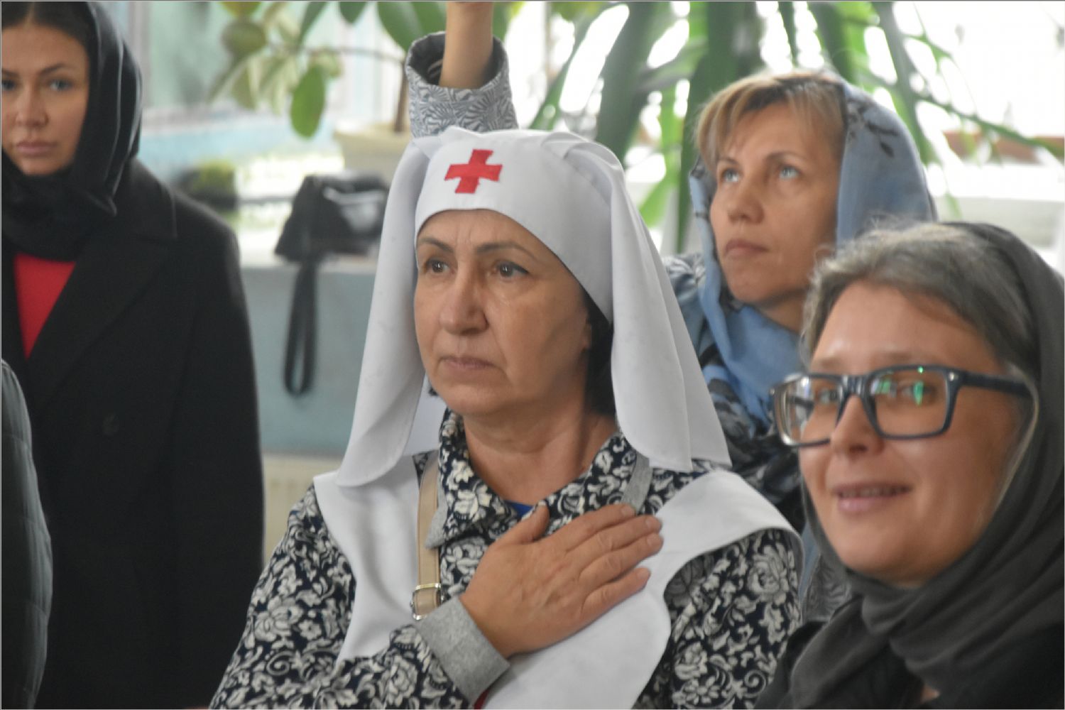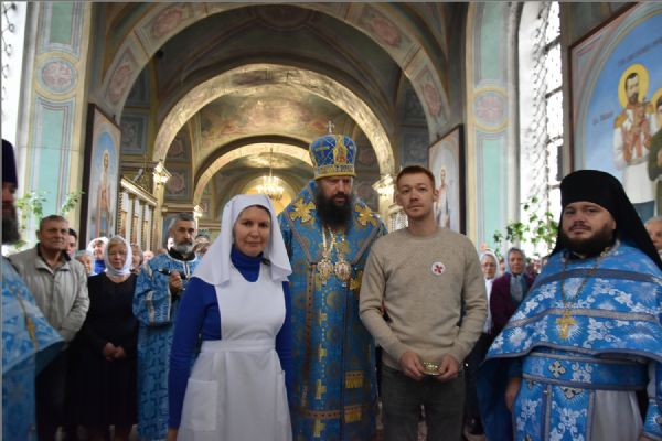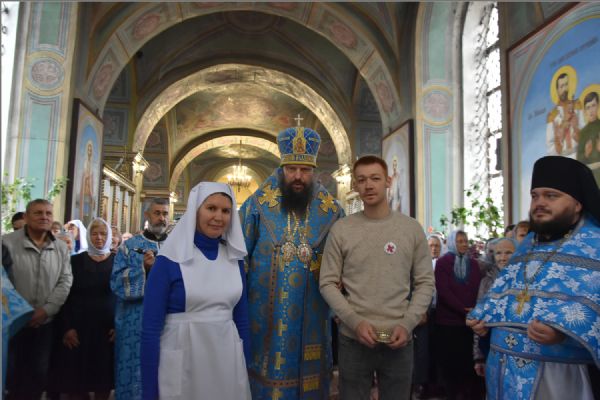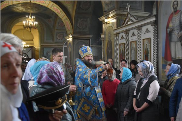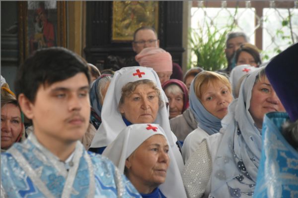 Перед Литургией владыка прочитал молитву на поставление на служение милосердия брату Виталию и кандидату в сестры милосердия сестре Наталье. Владыка сказал, что служение братом милосердия и сестрой милосердия — это большой труд, который можно отчасти сравнить с монашеским. Архипастырь пожелал новым членам Елабужского сестричества доброго служения для людей.