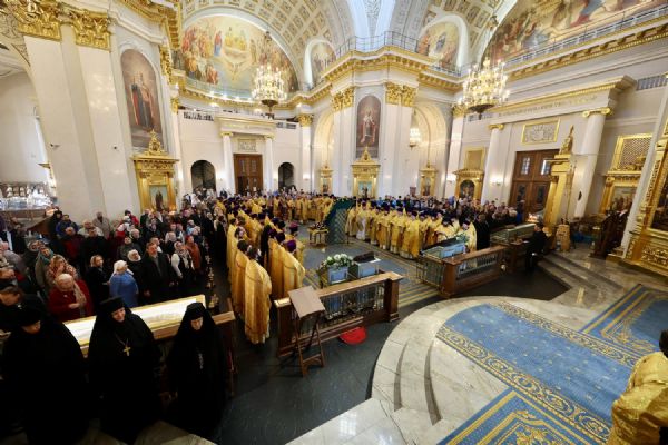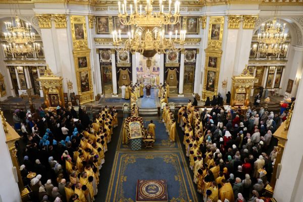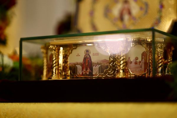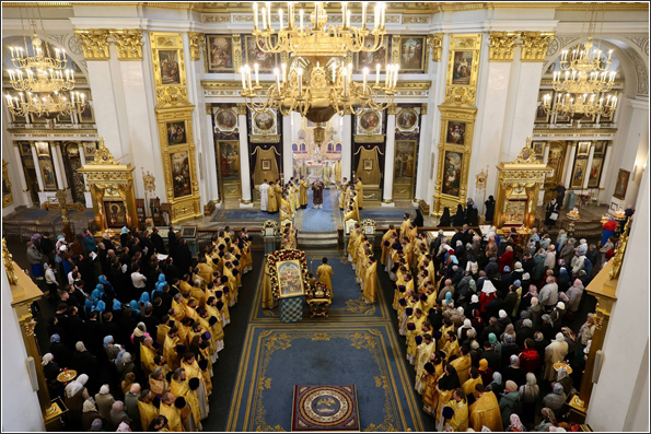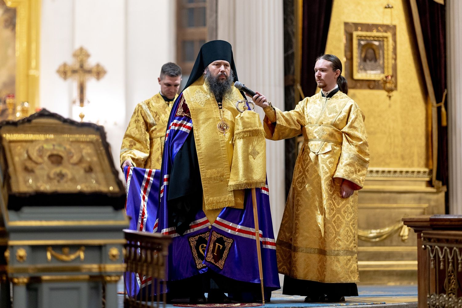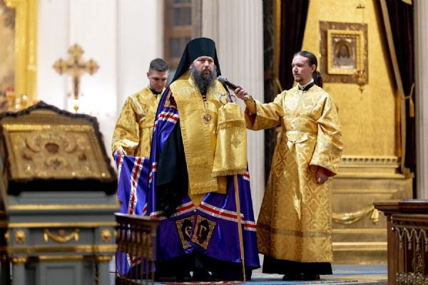 На середине храма для молитвенного поклонения верующих был установлен ковчег с частицей мощей святителя Луки Крымского, принесённый накануне в Казанский собор.