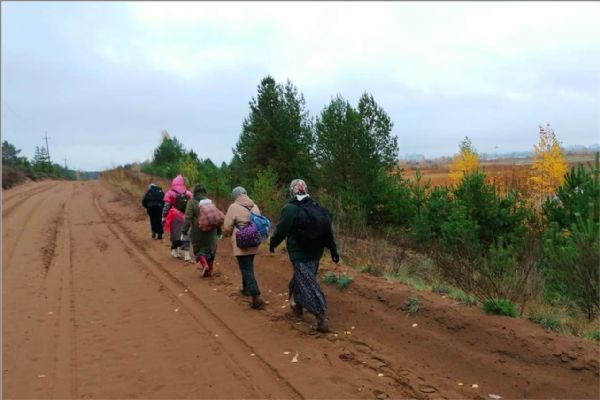 «От моросящего дождика песок был мокрый. Идти по песку не совсем легко, ноги проваливаются, но песок всегда лучше, чем грязь. По дороге на песке видели множество следов разных животных: лосей, кабанов, лис и еще неизвестных нам следов. Видимо, животные ходят на водопой к Каме, поэтому все следы строго пересекали песчаную трассу. С погодой нам тоже повезло — после моросящего дождя выглянуло солнце, так что мы даже успели посидеть на привале, погреться, немного обсушиться. Ходить по лесам и полям — это для нас счастье. Нелегко идти возле автотрассы, где шум, брызги и выхлопные газы от проезжающих машин. Но здесь свои плюсы: проезжая на машинах, люди видят нас, идущих с иконами, некоторые приветствуют короткими сигналами, а другие в суете земной может на минутку задумаются о небесном мире. Мы, христиане, любыми доступными методами должны нести свою миссию в мир», — делится своими впечатлениями и мыслями руководитель клуба Татьяна Лебедева.