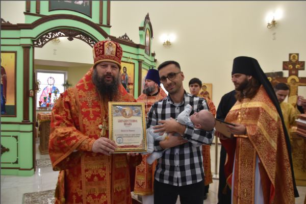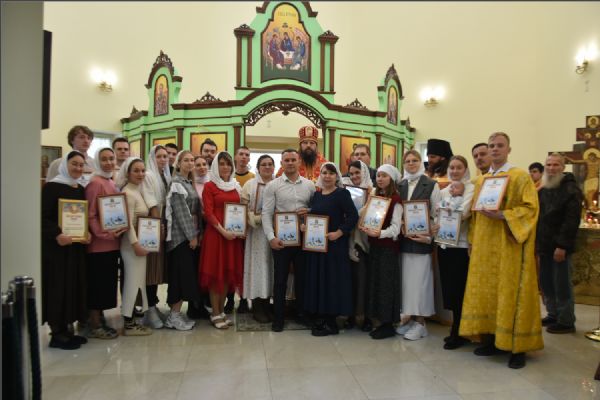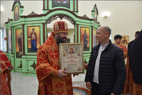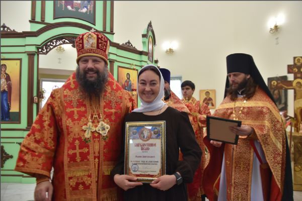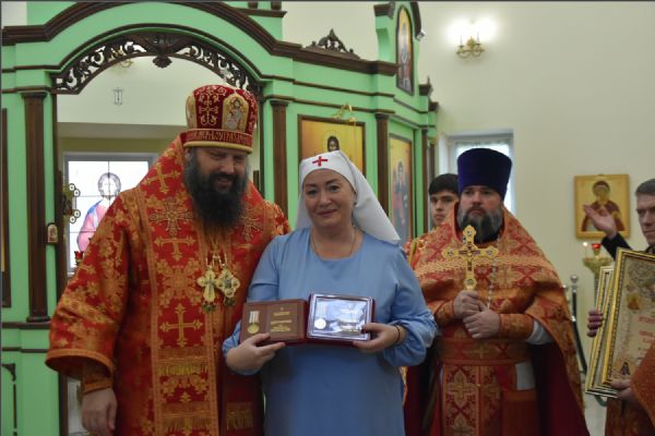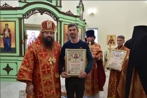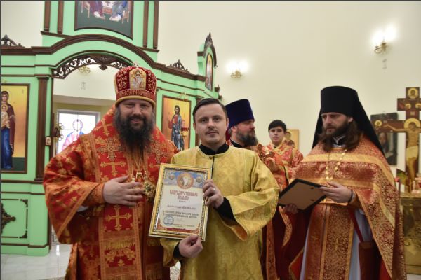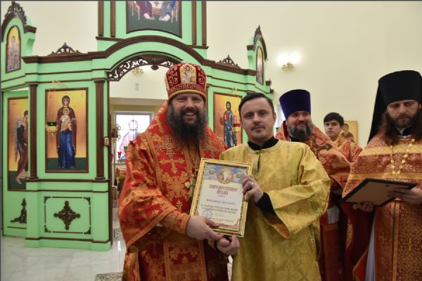 Затем архипастырь вручил епархиальные медали, грамоты и благодарственные письма людям, потрудившимся на приходе преподобного Серафима Саровского в строительстве духовно-просветительского центра и молодежной работы в епархии: Олегу Юрьевичу Тунгускову — медаль II степени святых мучеников Павла Елабужского и чад его Бориса, Григория и Симеона; Вячеславу Олеговичу Тунгускову — медаль III степени. Евгению и Сергею Яковлевым и Иоанну Гаранину — Архиерейскую грамоту; Ильдару Шангараеву, Алексею Ганину, Александру Васильеву, Марии Завгородней и Елене Есауленко — благодарственные письма. Также владыка вручил епархиальные благодарственные письма казакам, потрудившимся в строительстве духовно-просветительского центра и грамоты от прихода преподобного Серафима Саровского активным участникам групп православной молодежи в Набережных Челнах и Елабуге.