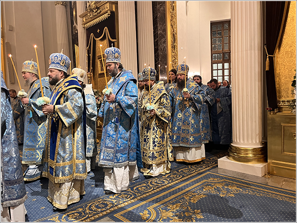 За полиелеем архипастыри и духовенство пропели акафист Пресвятой Богородице перед Её чтимым образом в правом приделе собора.