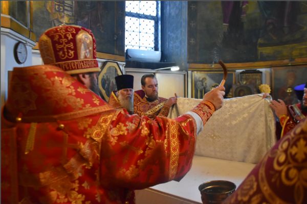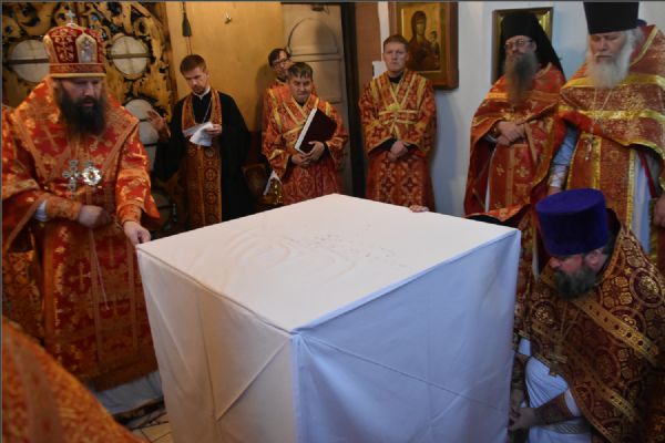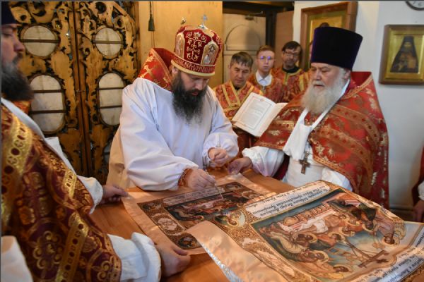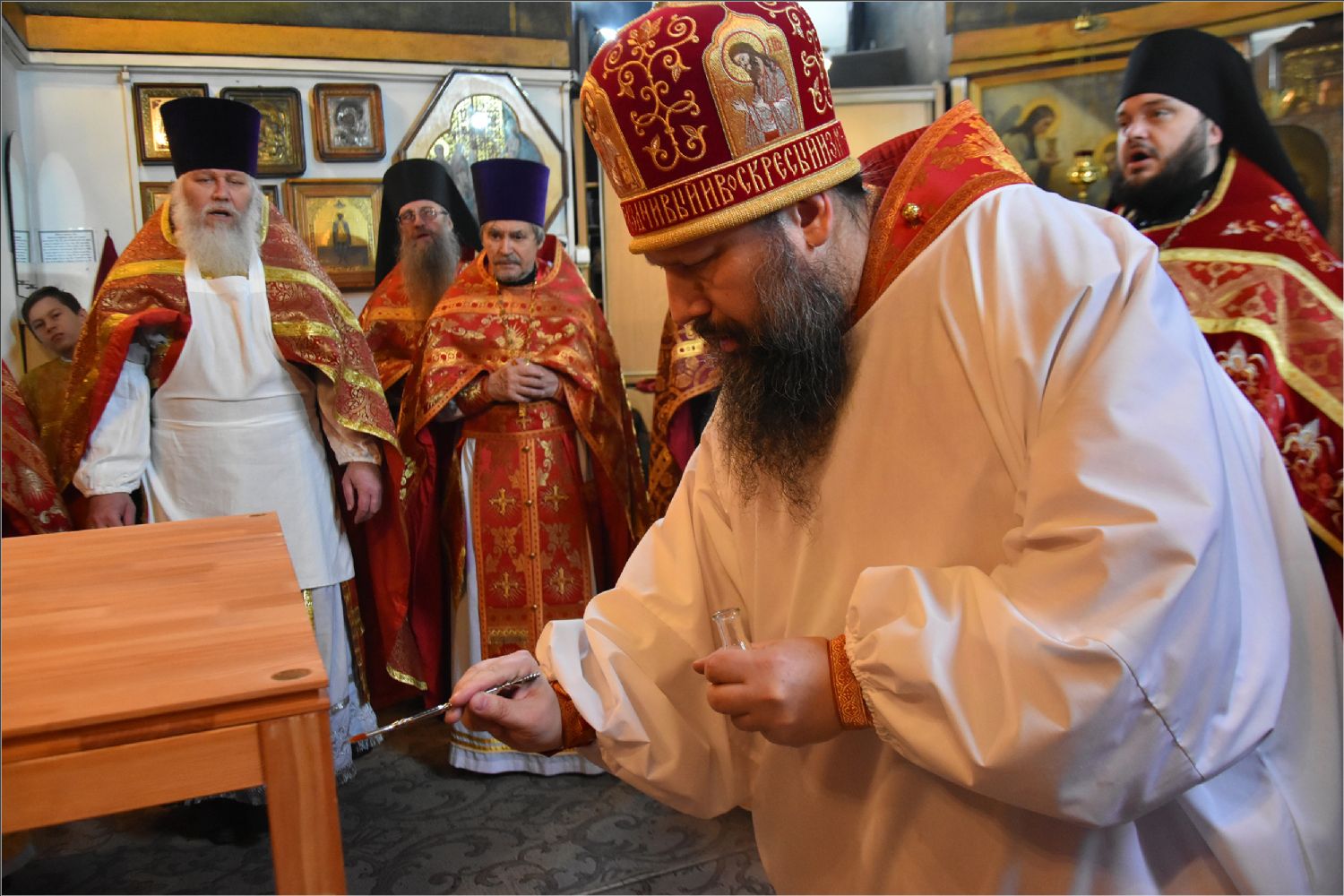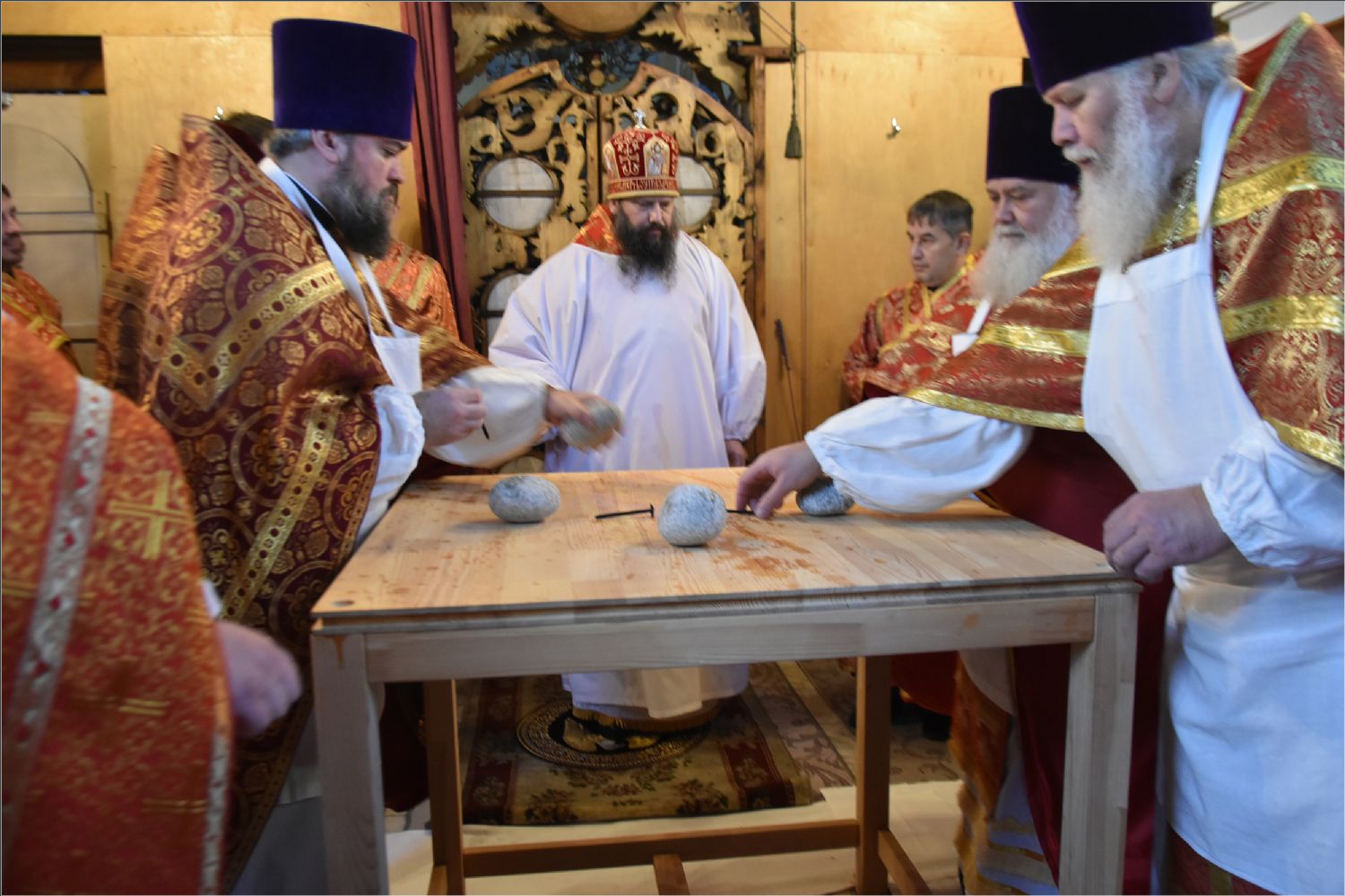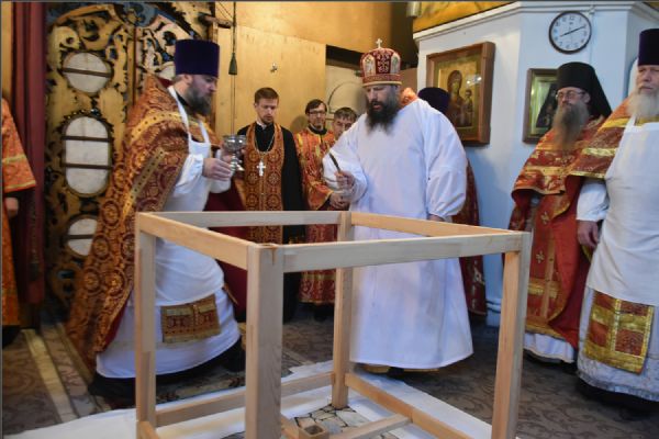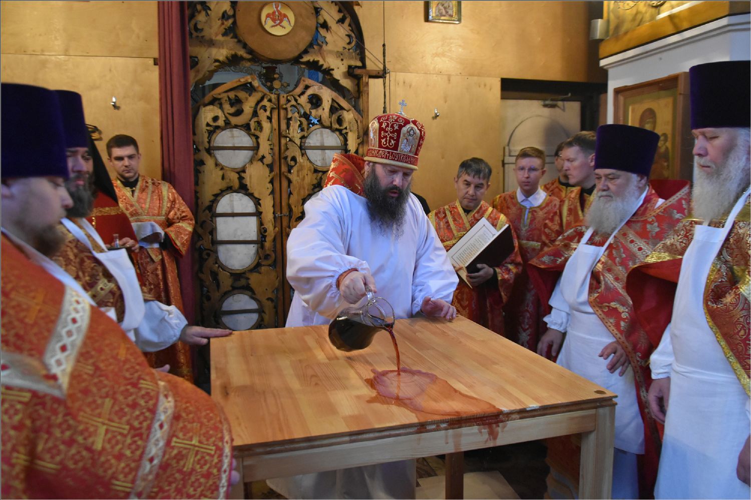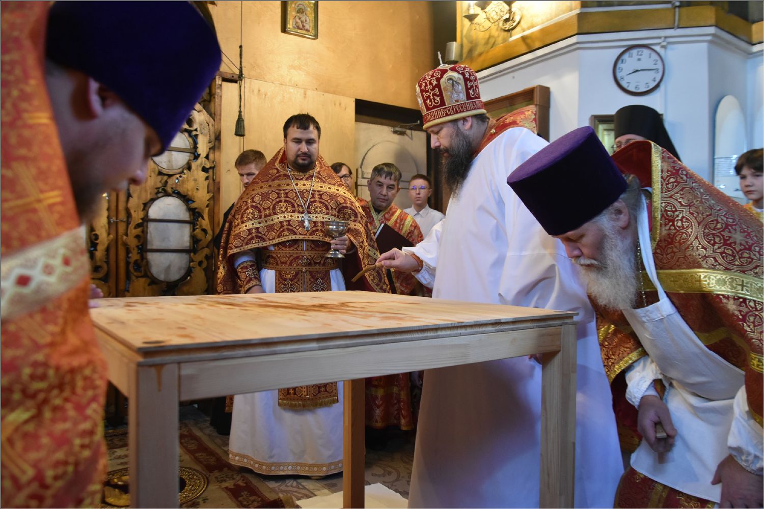 За закрытыми царскими дверями архипастырь и священники совершили чин освящения престола. Вокруг храма прошел крестный ход со святыми мощами, которые затем были положены под престол. Были освящены антиминсы для храмов епархии.