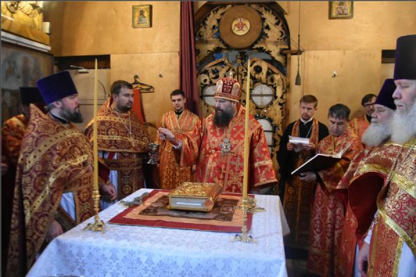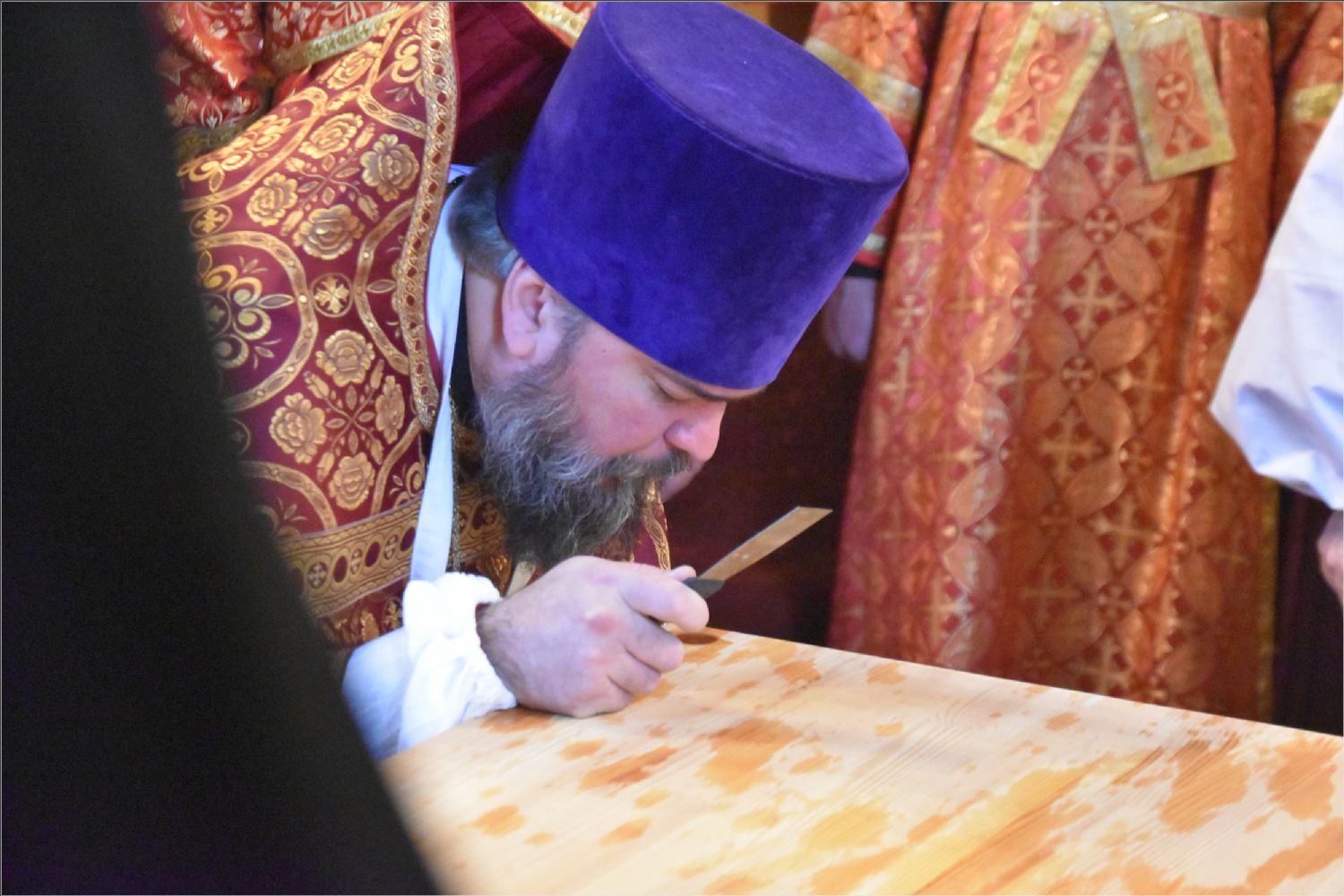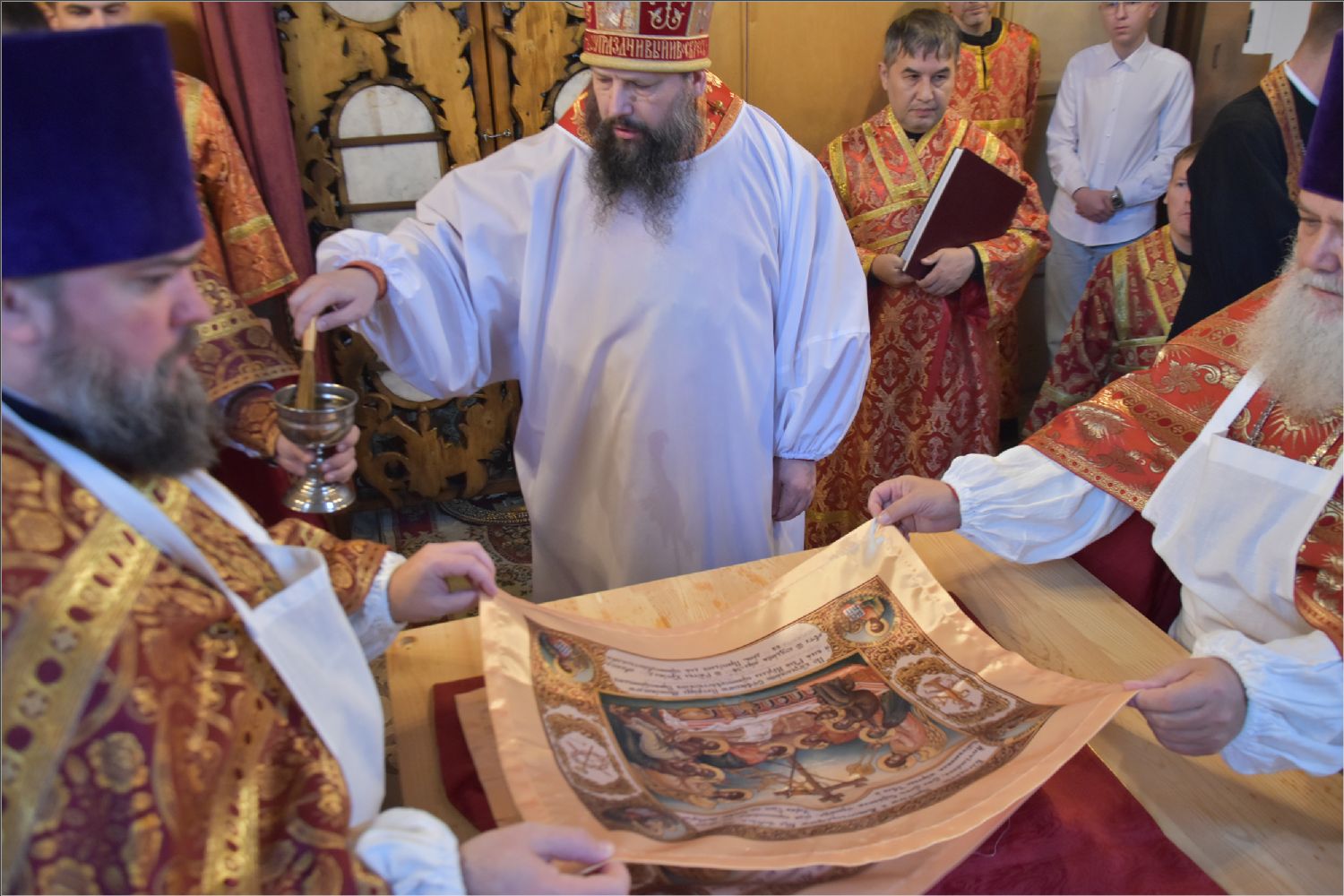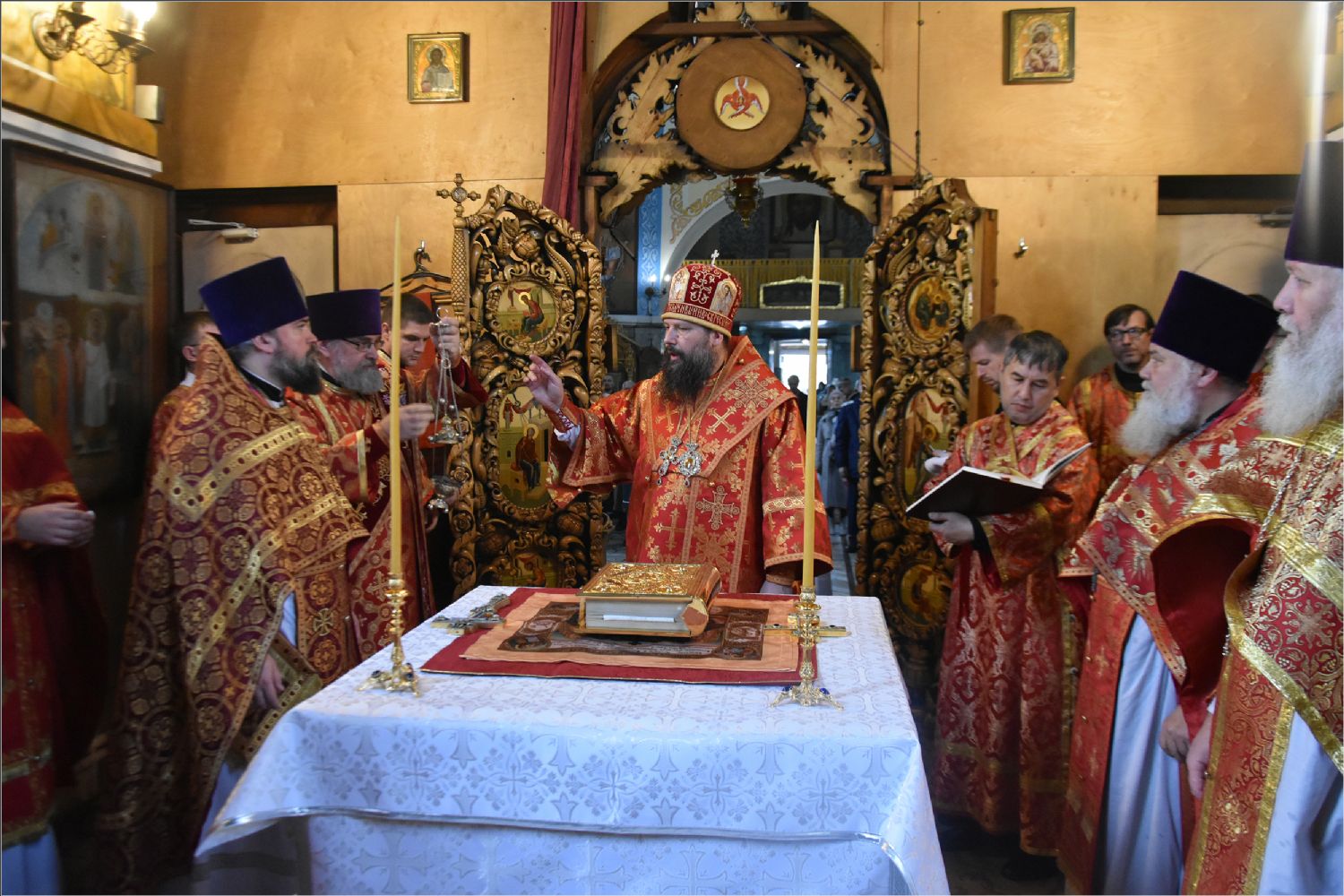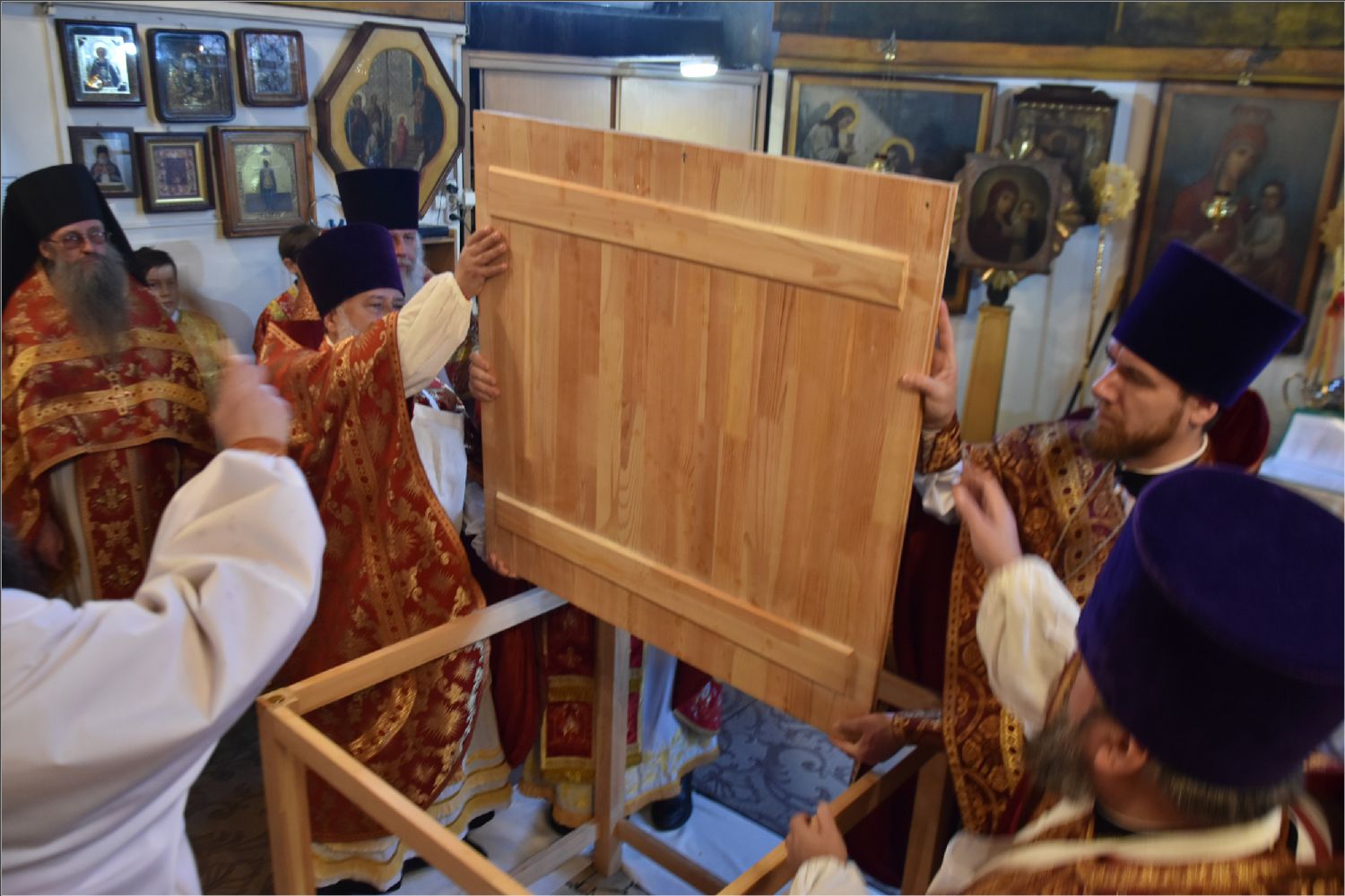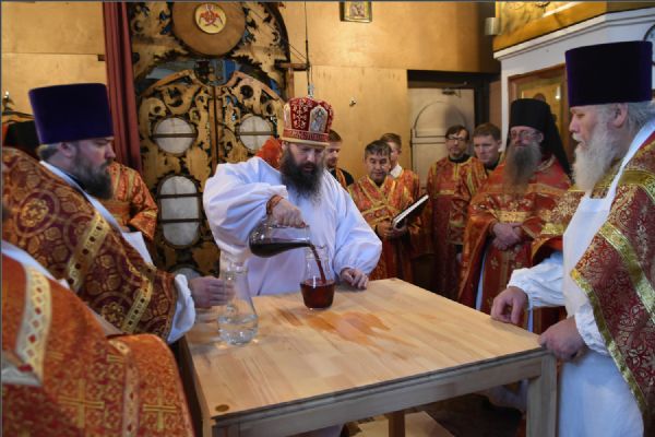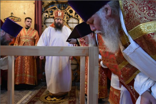За закрытыми царскими дверями архипастырь и священники совершили чин освящения престола. Вокруг храма прошел крестный ход со святыми мощами, которые затем были положены под престол. Были освящены антиминсы для храмов епархии.