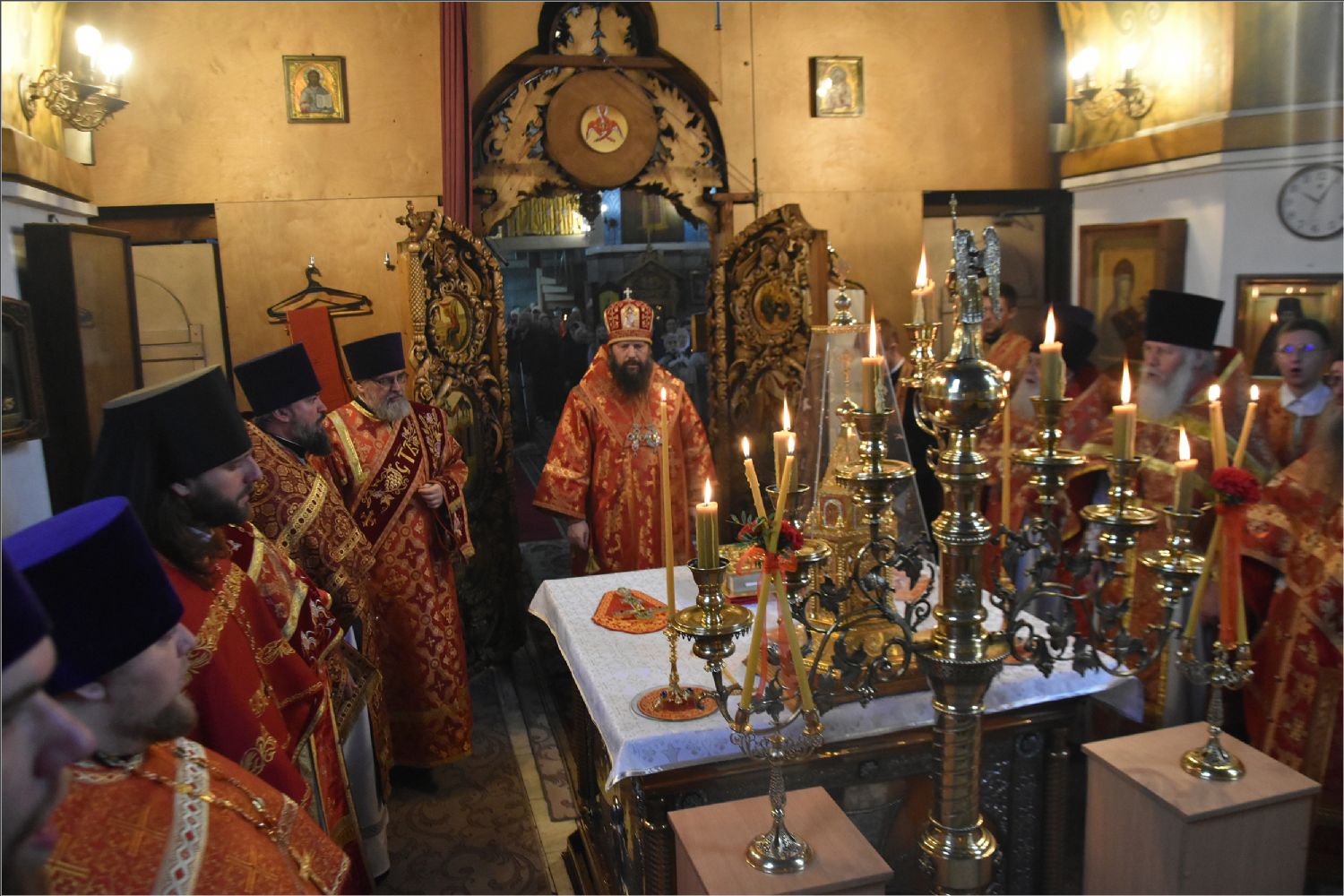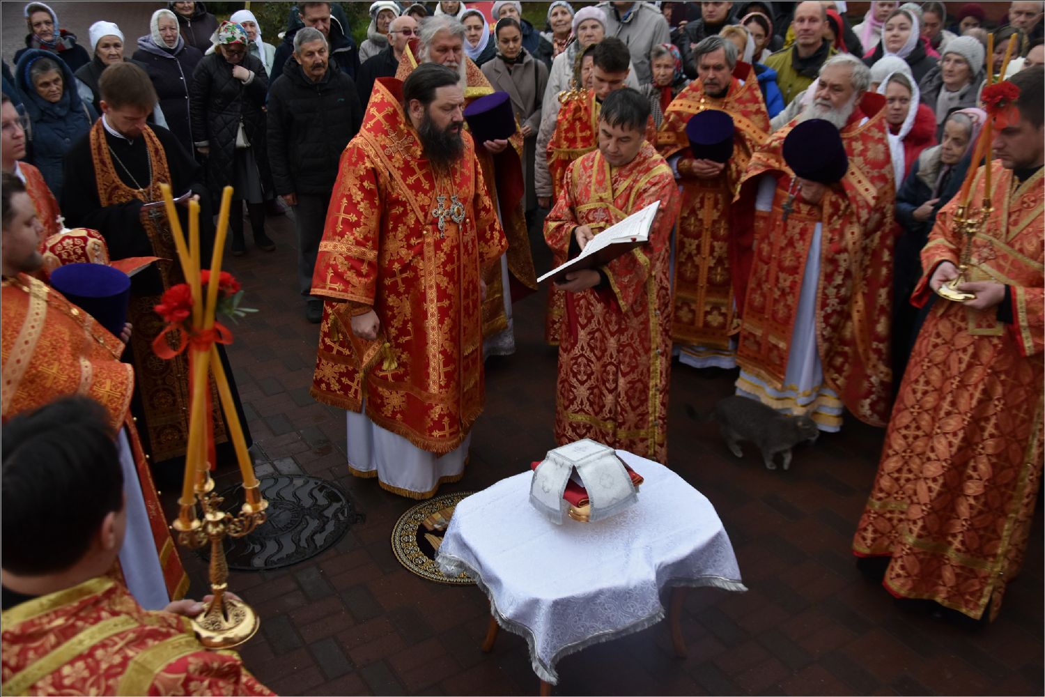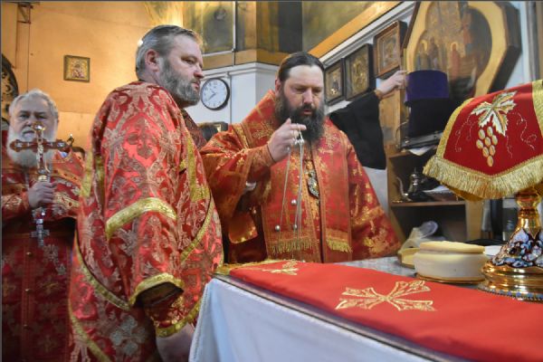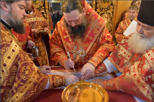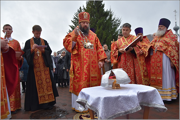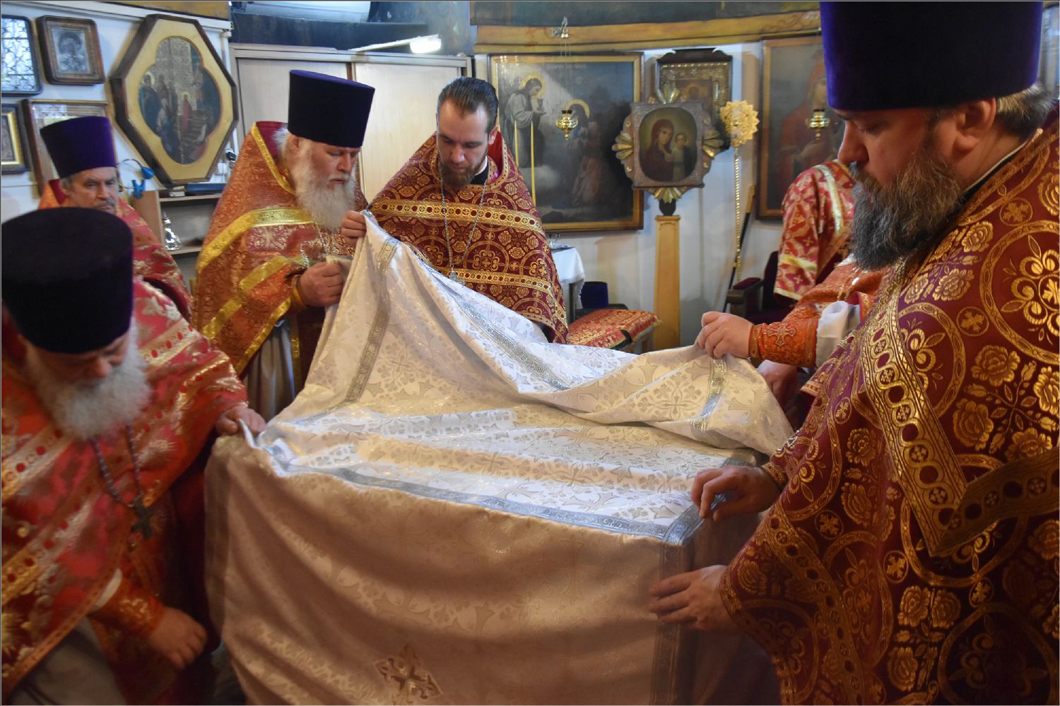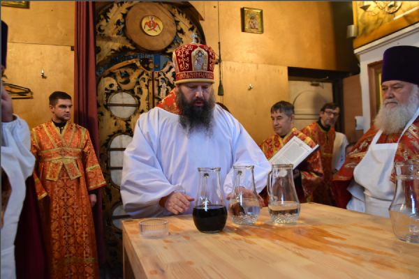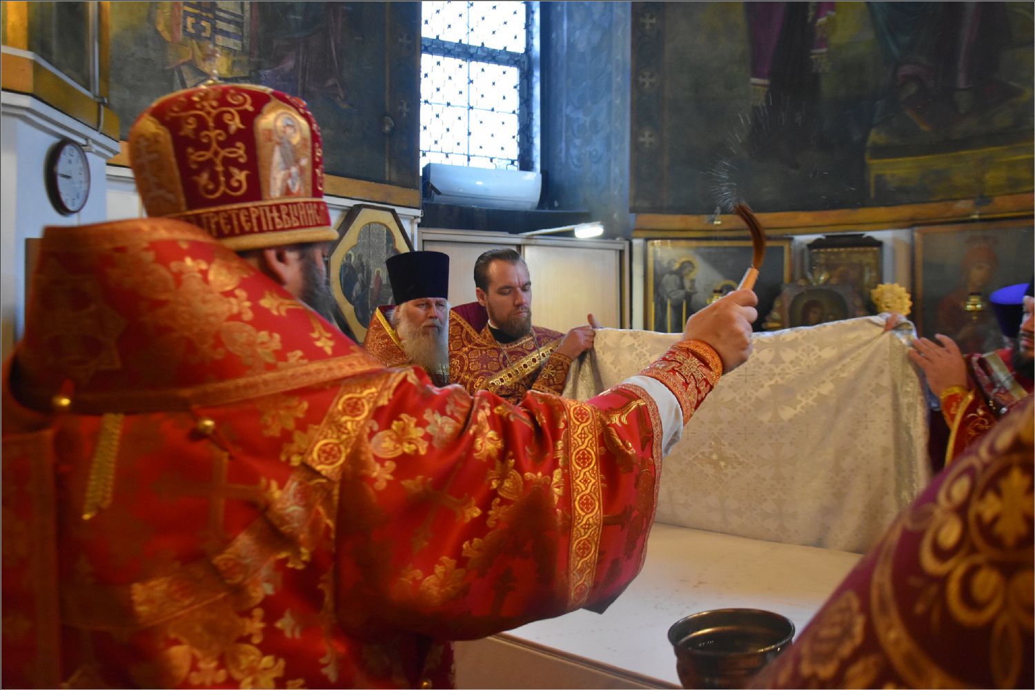 За закрытыми царскими дверями архипастырь и священники совершили чин освящения престола. Вокруг храма прошел крестный ход со святыми мощами, которые затем были положены под престол. Были освящены антиминсы для храмов епархии.
