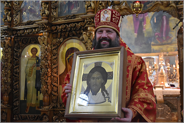 Настоятель храма протоиерей Андрей Дубровин подарил своем архипастырю икону Спасителя.