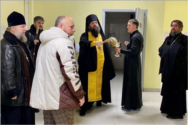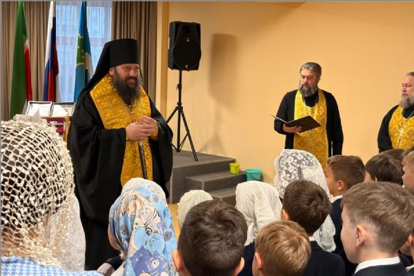 Архиерей совершил чин малого освящения воды. Архипастырю сослужили секретарь епархии и директор гимназии протоиерей Андрей Лосык, настоятель храма великомученика Георгия Победоносца города Набережные Челны протоиерей Валерий Каранаев, настоятель храма святителя Тихона города Набережные Челны иерей Дионисий Васильев.