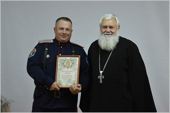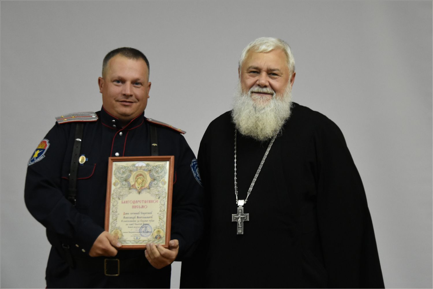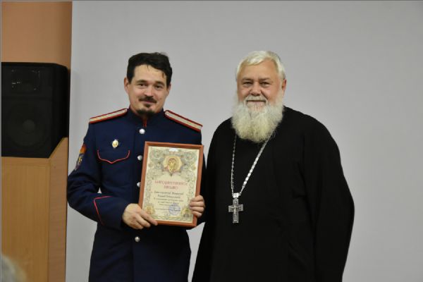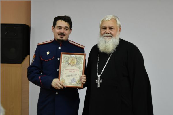Протоиерей Андрей Дубровин вручил двум казакам епархиальные благодарственные письма.