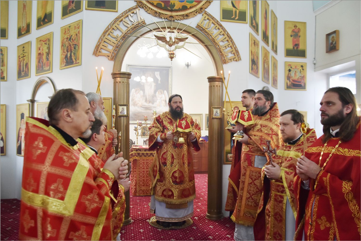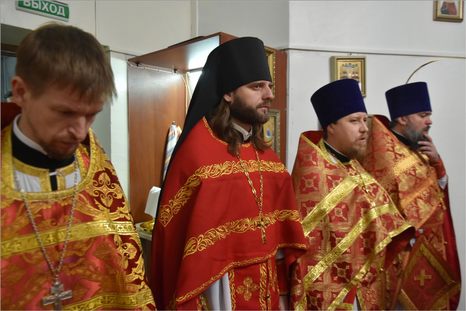 Архипастырю сослужили секретарь Набережночелнинской епархии протоиерей Андрей Лосык, благочинный Закамского округа протоиерей Андрей Дубровин, настоятель храма Воздвижения Креста Господня города Набережные Челны протоиерей Сергий Писковцев, настоятель храма святителя Тихона города Набережные Челны иерей Дионисий Васильев, настоятель храма преподобного Серафима Саровского города Набережные Челны иеромонах Амвросий (Степанюк), настоятель храма преподобного Макария Желтоводского села Ильбухтино Тукаевского района иерей Владимир Забалуев, клирик Свято-Вознесенского кафедрального собора иерей Сергий Иноземцев. Диаконский чин возглавил протодиакон Дмитрий Половников. Песнопения исполнил мужской состав архиерейского хора под управлением Евгения Моромова.
