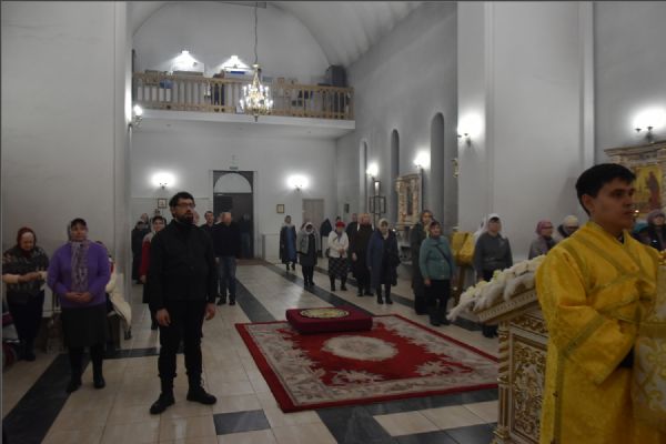 Вечером Его Преосвященству сослужили благочинный Закамского округа протоиерей Андрей Дубровин, настоятель храма иконы Божией Матери «Неупиваемая Чаша» города Набережные Челны протоиерей Владимир Иванов, ключарь Казанско-Богородицкой церкви иерей Димитрий Веретнов, клирик прихода иерей Алексий Носов и клирик Свято-Вознесенского кафедрального собора иерей Сергий Иноземцев. Диаконский чин возглавил протодиакон Дмитрий Половников. Песнопения исполнил смешанный приходской хор под управлением Татьяны Вылку.