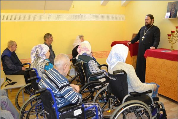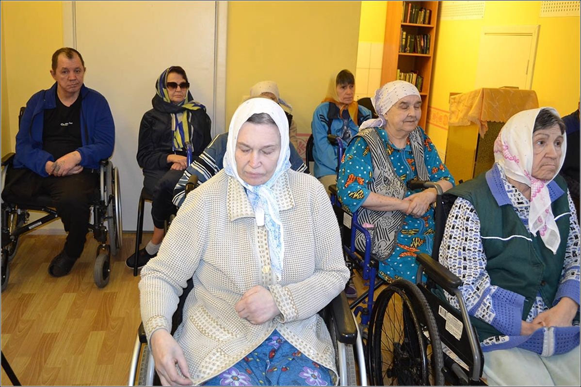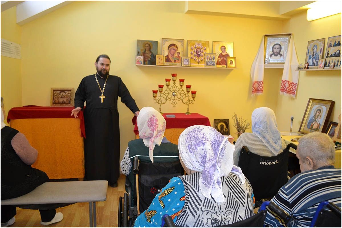 На попечении сестричества также находится и Елабужский дом-интернат для престарелых и инвалидов, на базе которого функционирует православный кружок «Благословение». На очередной встрече с пожилыми людьми отец Илия Кривов вынес на обсуждение отрывок из пятой главы Евангелия от Марка, повествующий об исцелении гадаринского бесноватого: «человек, одержимый нечистым духом, он имел жилище в гробах, и никто не мог его связать даже цепями, потому что многократно был он скован оковами и цепями, но разрывал цепи и разбивал оковы» (Мк. 5, 2-4). В завершении беседы батюшка поделился новостями епархии, напомнил о Всемирном дне памяти жертв ДТП, отмечающемся ежегодно в третье воскресенье ноября, а также ответил на вопросы подопечных социального учреждения.