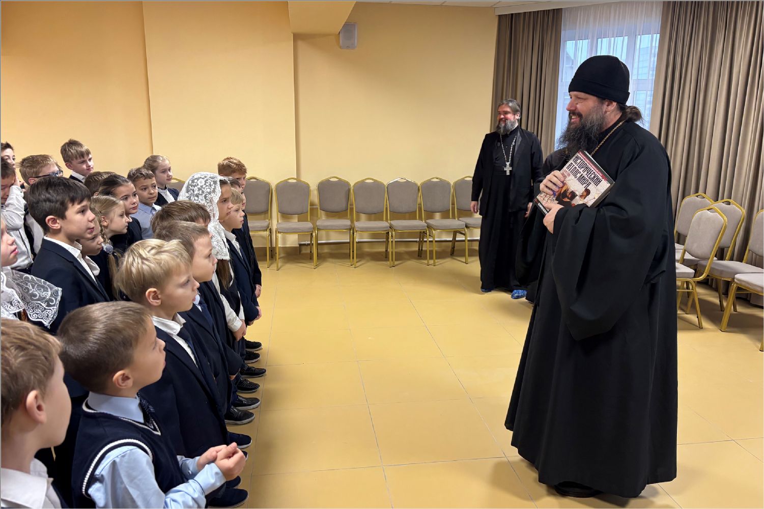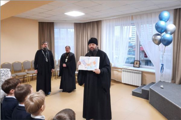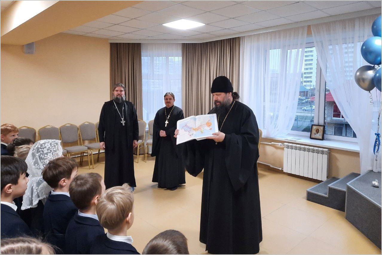 Совершив молитвословие, архиерей обратился к детям. Владыка подарил для библиотеки гимназии Исторический атлас мира и рассказал поучительную историю о том, что наши Ангелы Хранители радуются, когда мы совершаем добрые дела, хорошо учимся и примерно ведем себя.