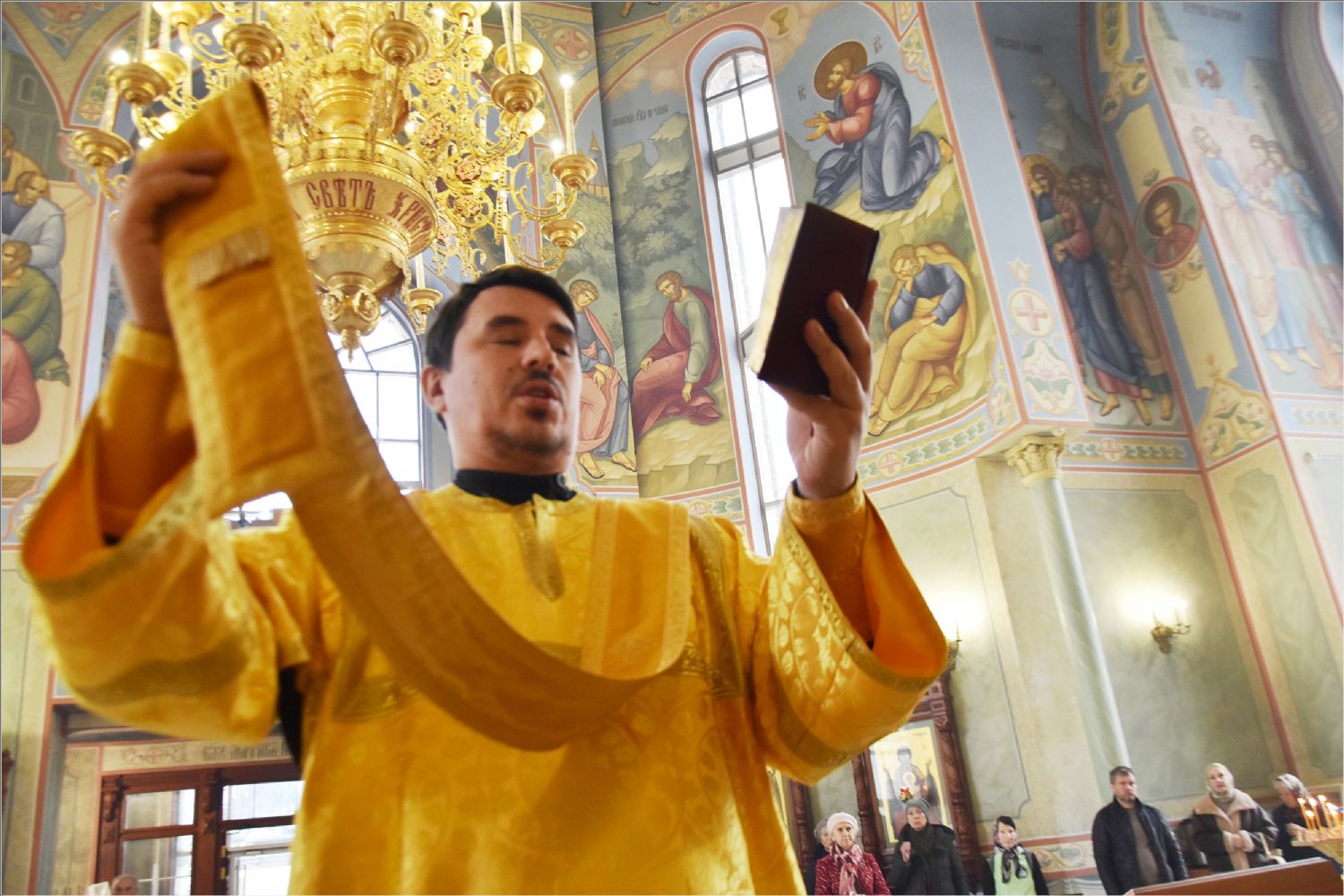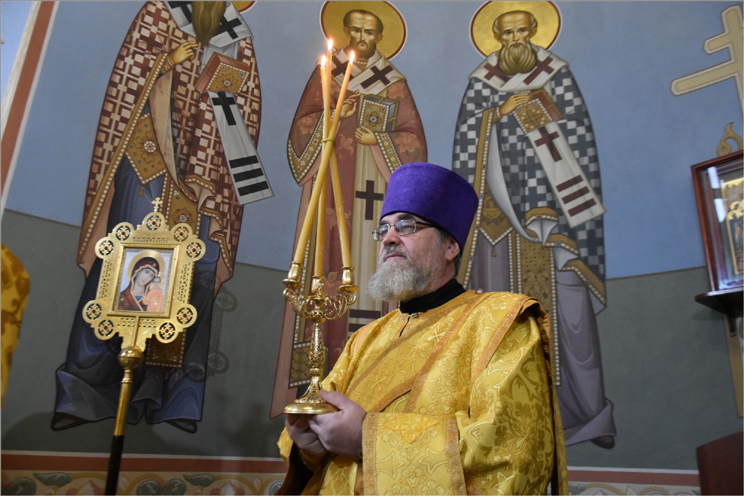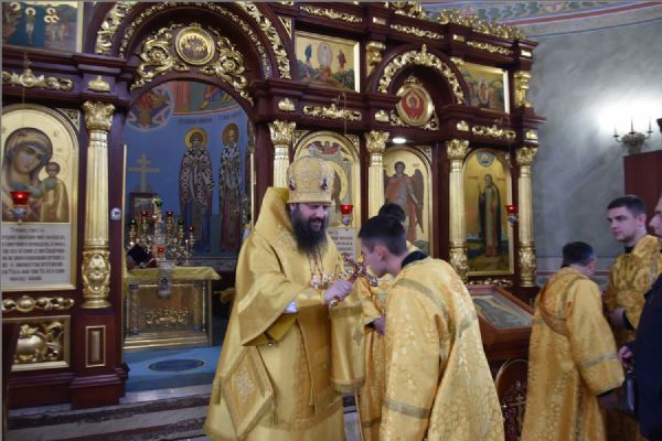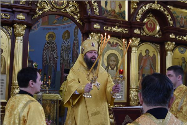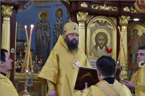 На мирной и сугубой ектениях были вознесены молитвенные прошения о Российском воинстве и о мире. По запричастном стихе проповедь произнёс протоиерей Сергий Козлов.