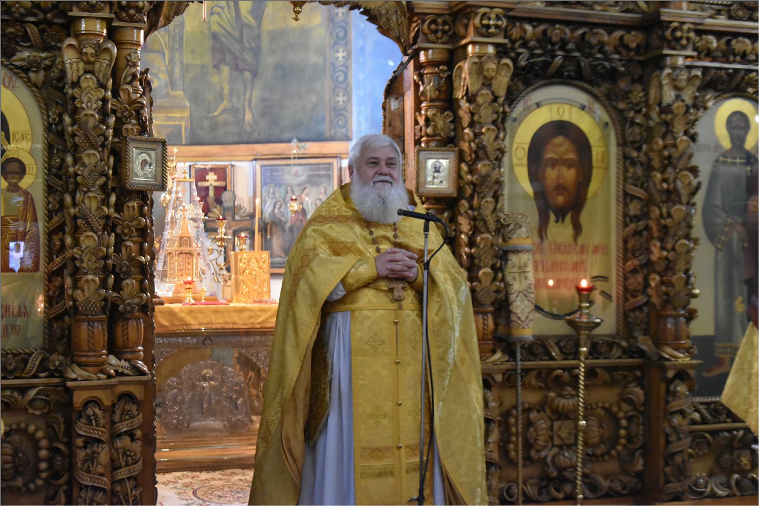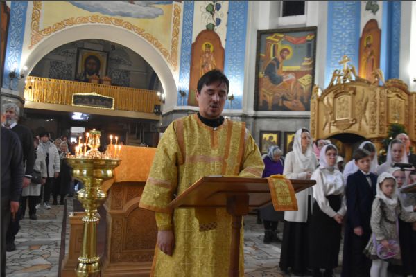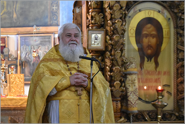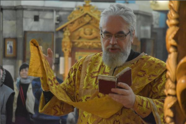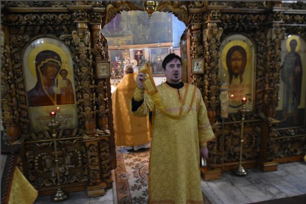 На мирной и сугубой ектениях были вознесены молитвенные прошения о Российском воинстве и о мире. Проповедь по чтении Евангелия произнес протоиерей Андрей Дубровин:
