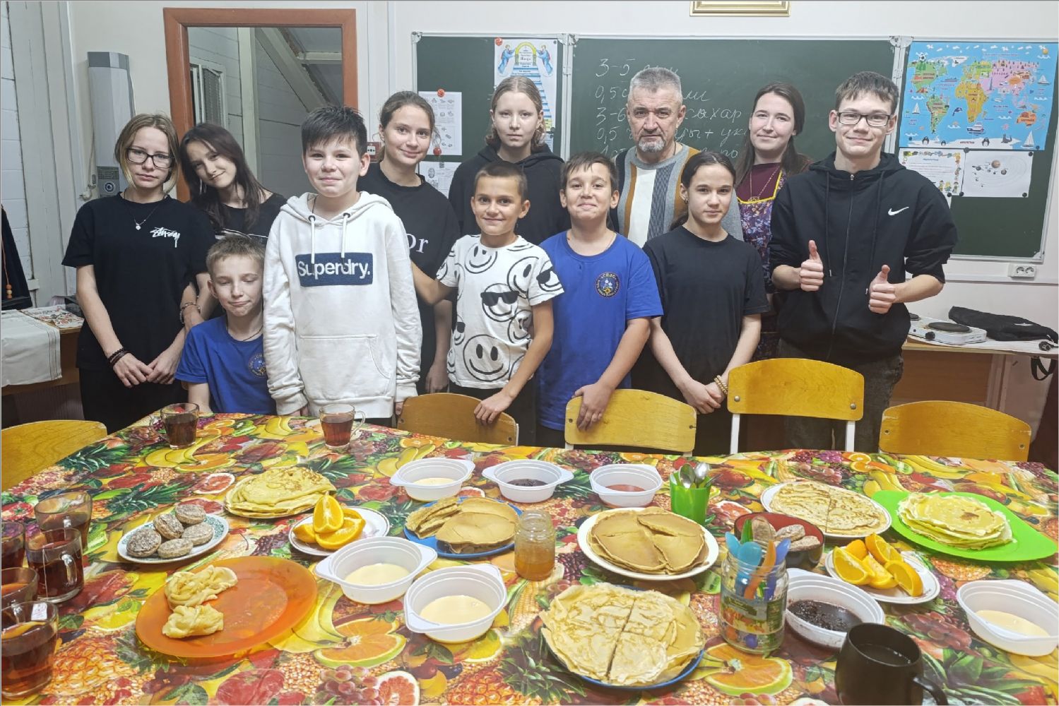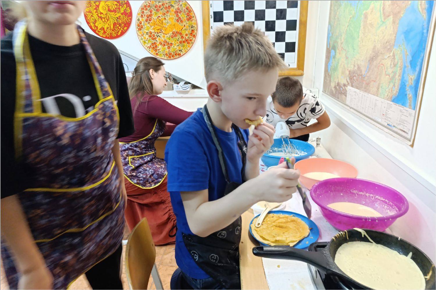 Дети надели фартуки, приготовили все необходимое. Педагог Ольга Желтоножко поделилась своим семейным рецептом, а затем вместе с педагогом клуба Аленой Апариной присматривала за процессом. Ребята научились всем премудростям замешивания теста для блинчиков — как управляться с продуктами, в какой последовательности выкладывать их в тесто, и сразу же приступили к выпечке. Здесь тоже есть свои тонкости — не у всех блинчики получались, приходилось искать ошибки.