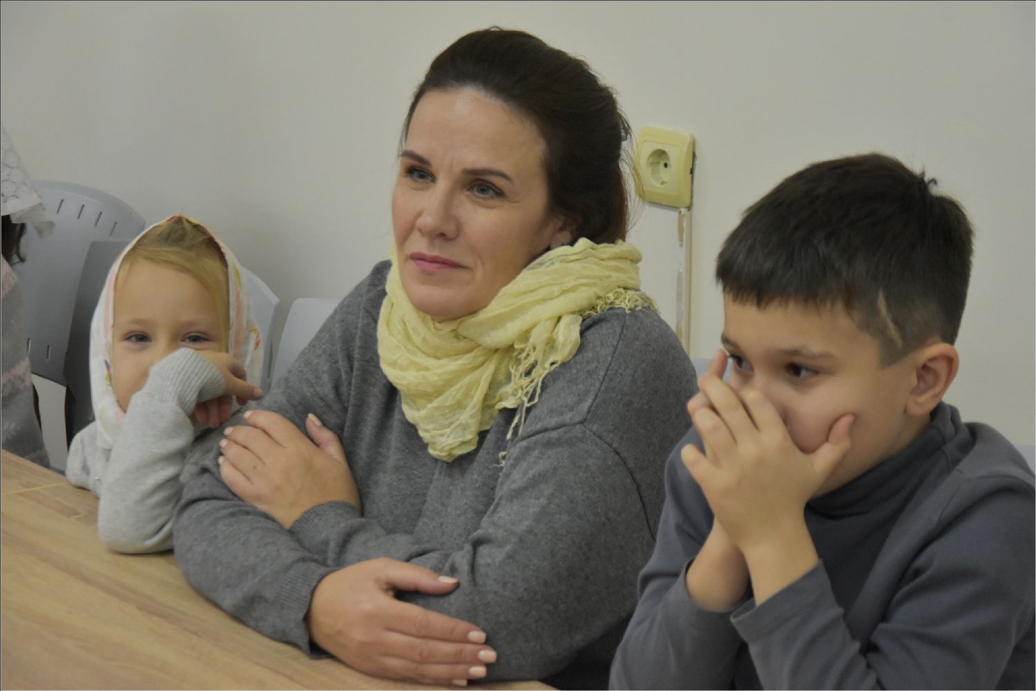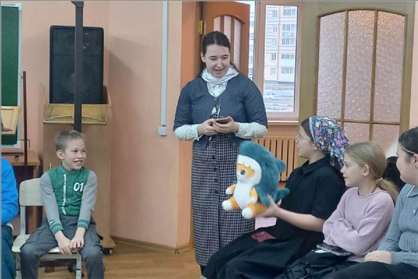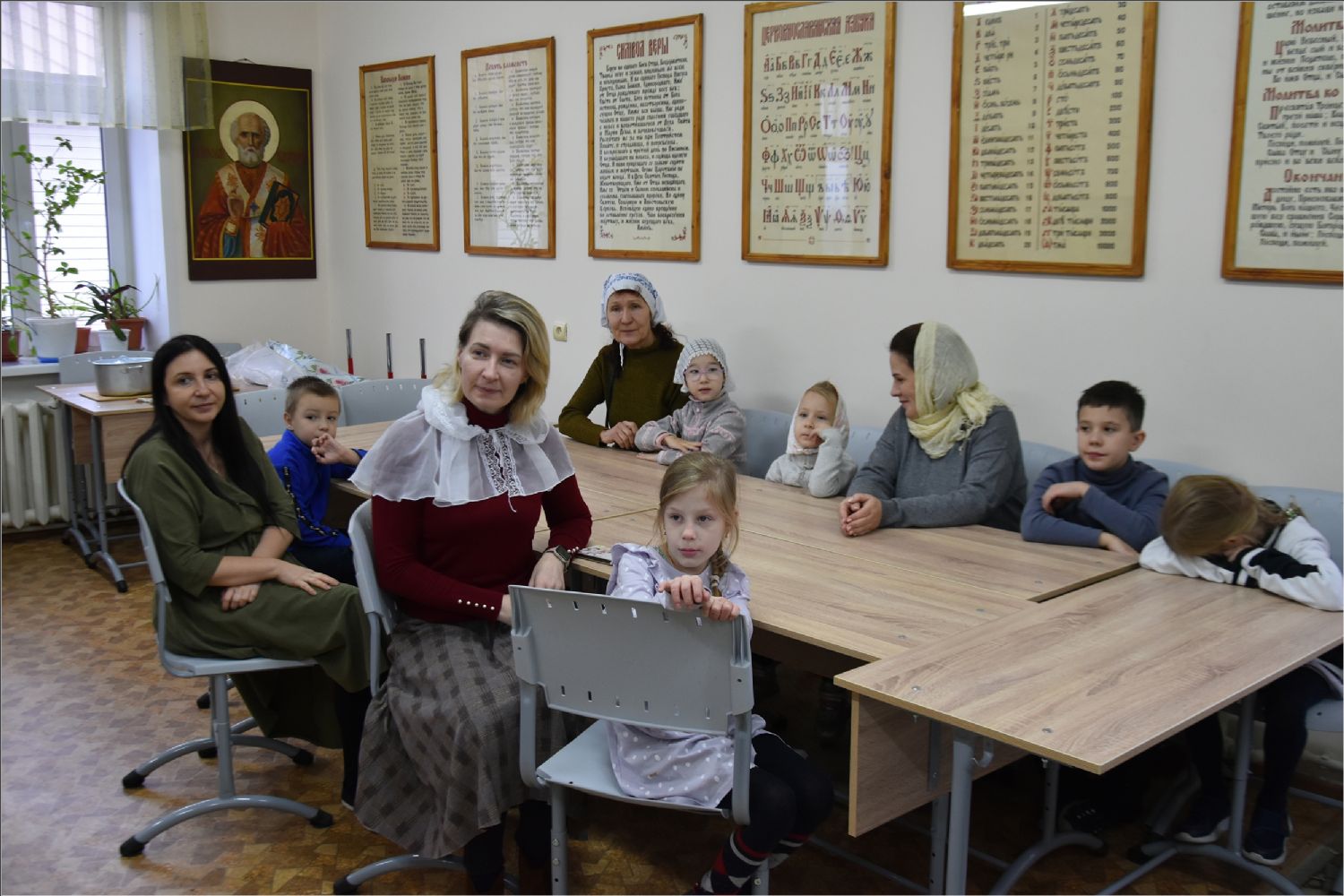 По окончании Божественной литургии воспитанники групп «Веди» и «Глаголь» вместе с педагогом Аленой Александровной поздравляли прихожанок и дарили им открытки со сладостями, после чего состоялось совместное чаепитие.