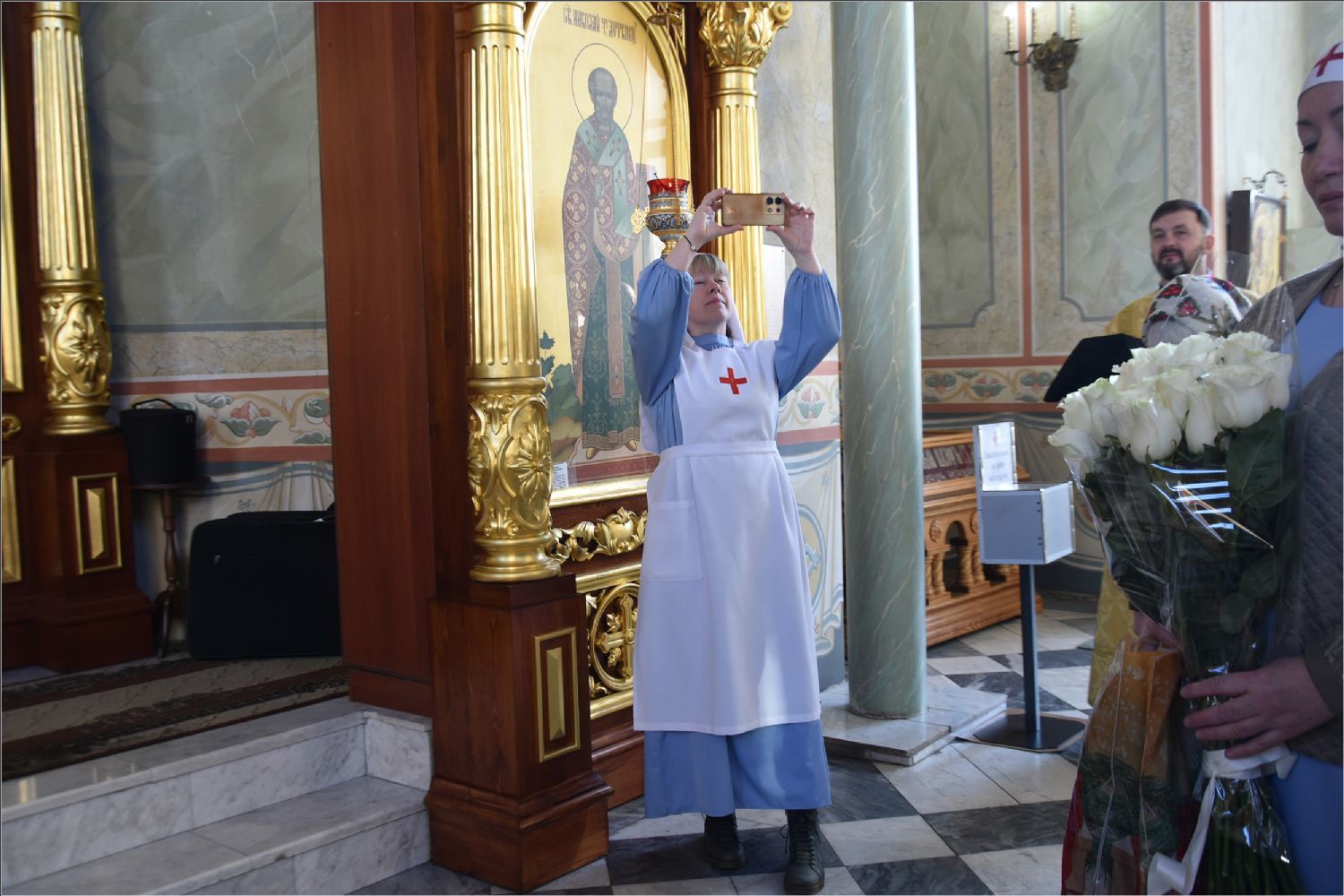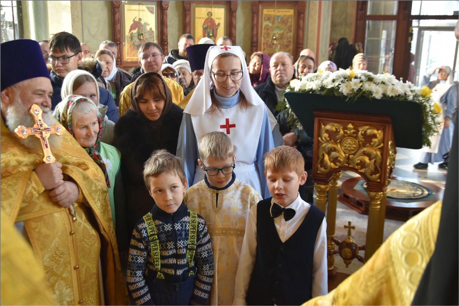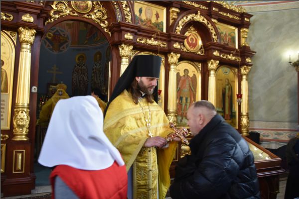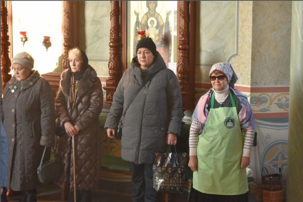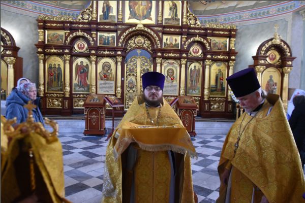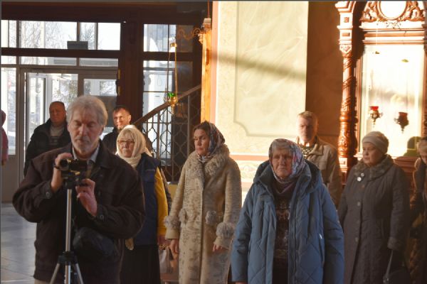 Богослужебные песнопения исполнил приходской женский хор под управлением Юлии Федоткиной. На мирной и сугубой ектениях были вознесены молитвы о Российском воинстве и о мире. Проповедь по запричастном стихе произнес иерей Александр Макариков. Священник рассказал о святителе Амвросии.