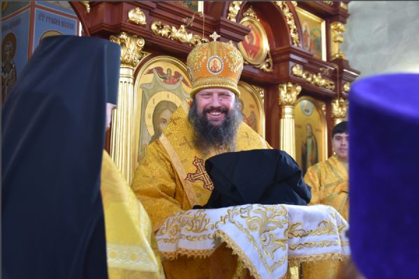 «Дорогой Владыко, благодарю Вас за Ваше отеческое внимание. Вы являетесь примером отца, который разделяет со своими чадами и радости, и огорчения. Вы для нас тот маяк, стремясь на свет которого, мы приходим к совершенству. Просим Ваших отеческих молитв за нас, которые укрепляют наши силы. Разрешите вручить Вам, Владыко, монашеский клобук».