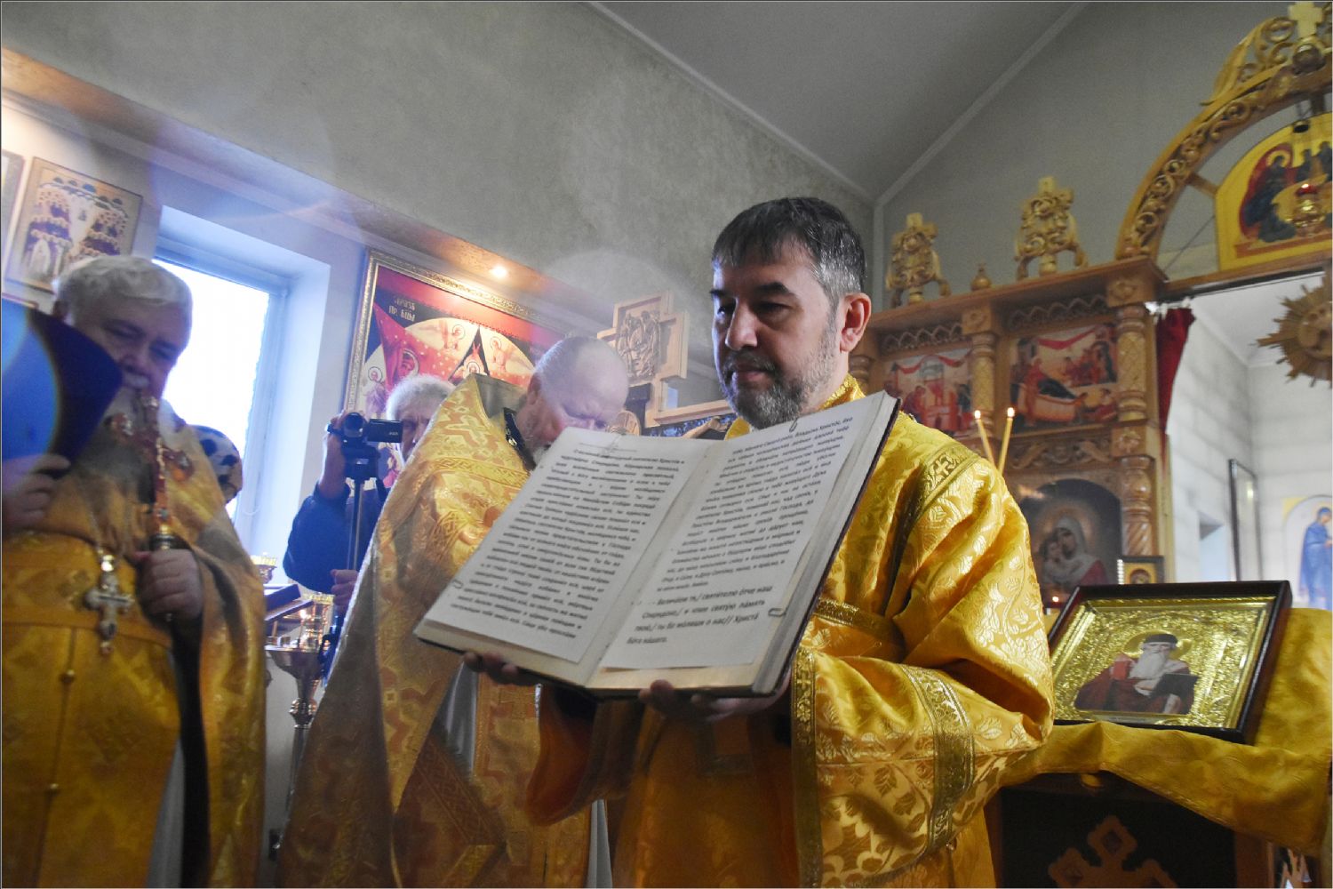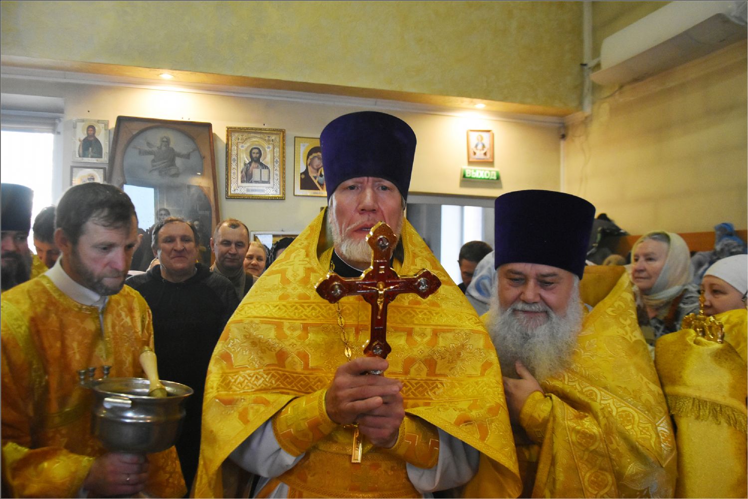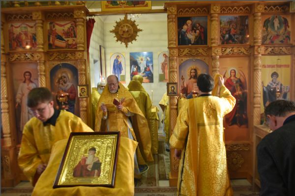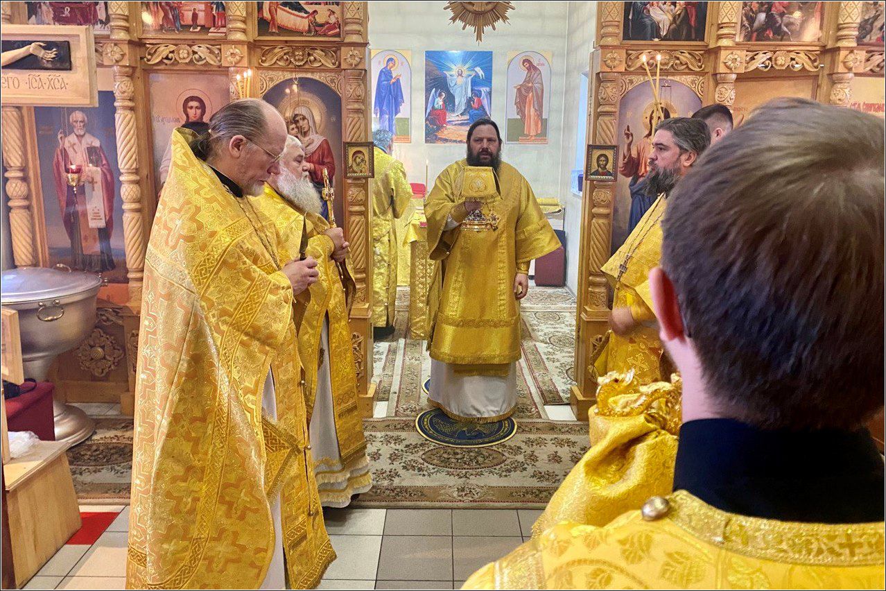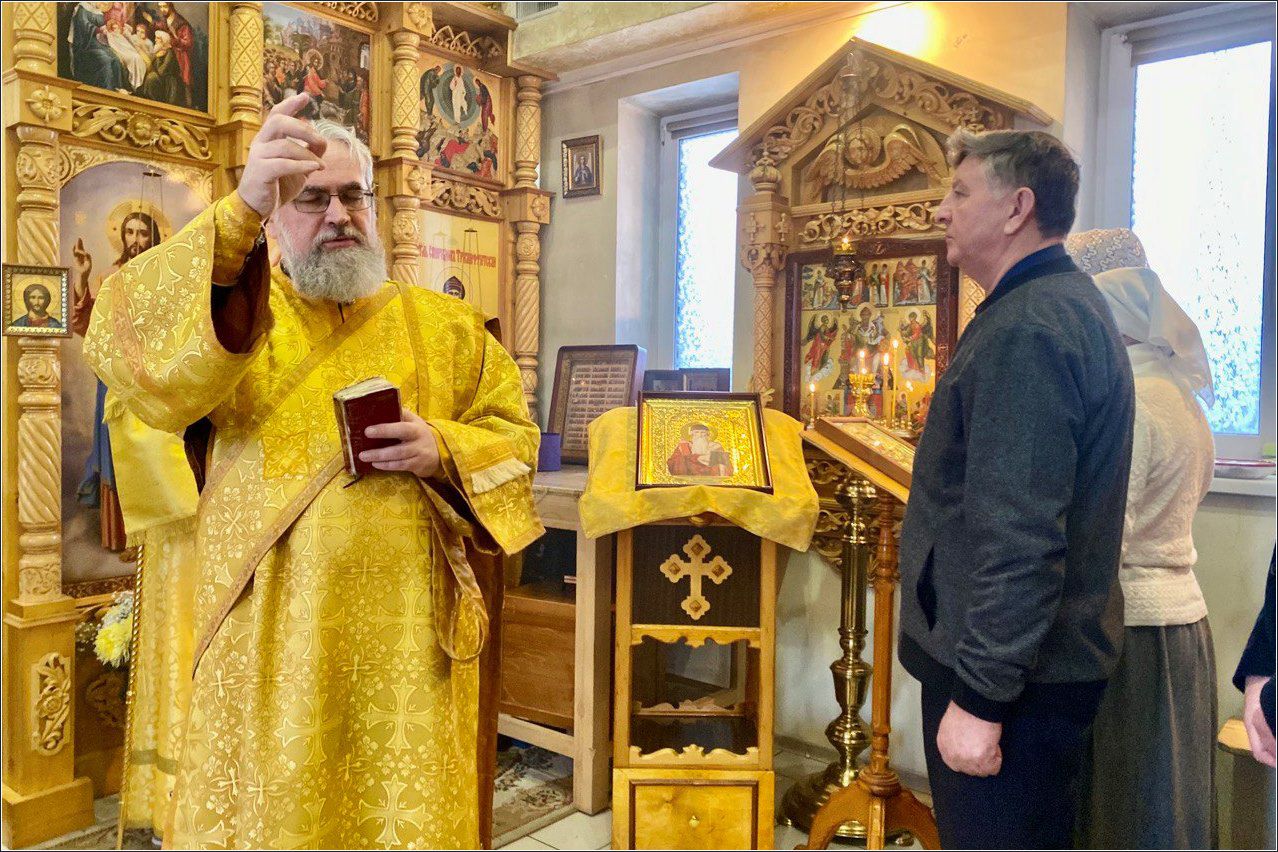 На мирной и сугубой ектениях Литургии были вознесены молитвы о Российском воинстве и о мире. По запричастном стихе проповедь произнёс протоиерей Рафаил Миронов, который рассказал о житии и чудесах святителя.
