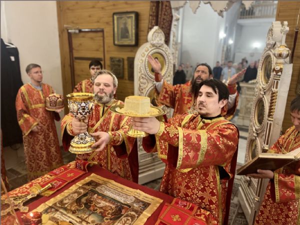 Его Преосвященству сослужили благочинный Закамского округа протоиерей Андрей Дубровин, клирик Елабужского Казанско-Богородицкого женского монастыря иерей Филипп Удовенко, клирики прихода Казанской иконы Божией Матери иерей Алексий Носов и иерей Иоанн Можаев. Диаконский чин возглавил диакон Виталий Семенов. Песнопения исполнил приходской смешанный хор под управлением Татьяны Вылку.