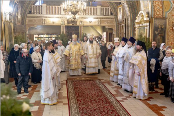 Песнопения исполнил архиерейский смешанный хор под управлением Марины Литвиненко. На мирной и сугубой ектениях были вознесены молитвы о Российском воинстве и о мире. По запричастном стихе проповедь произнёс протоиерей Николай Тимофеев. В завершение было совершено славление празднику Рождества Христова.
