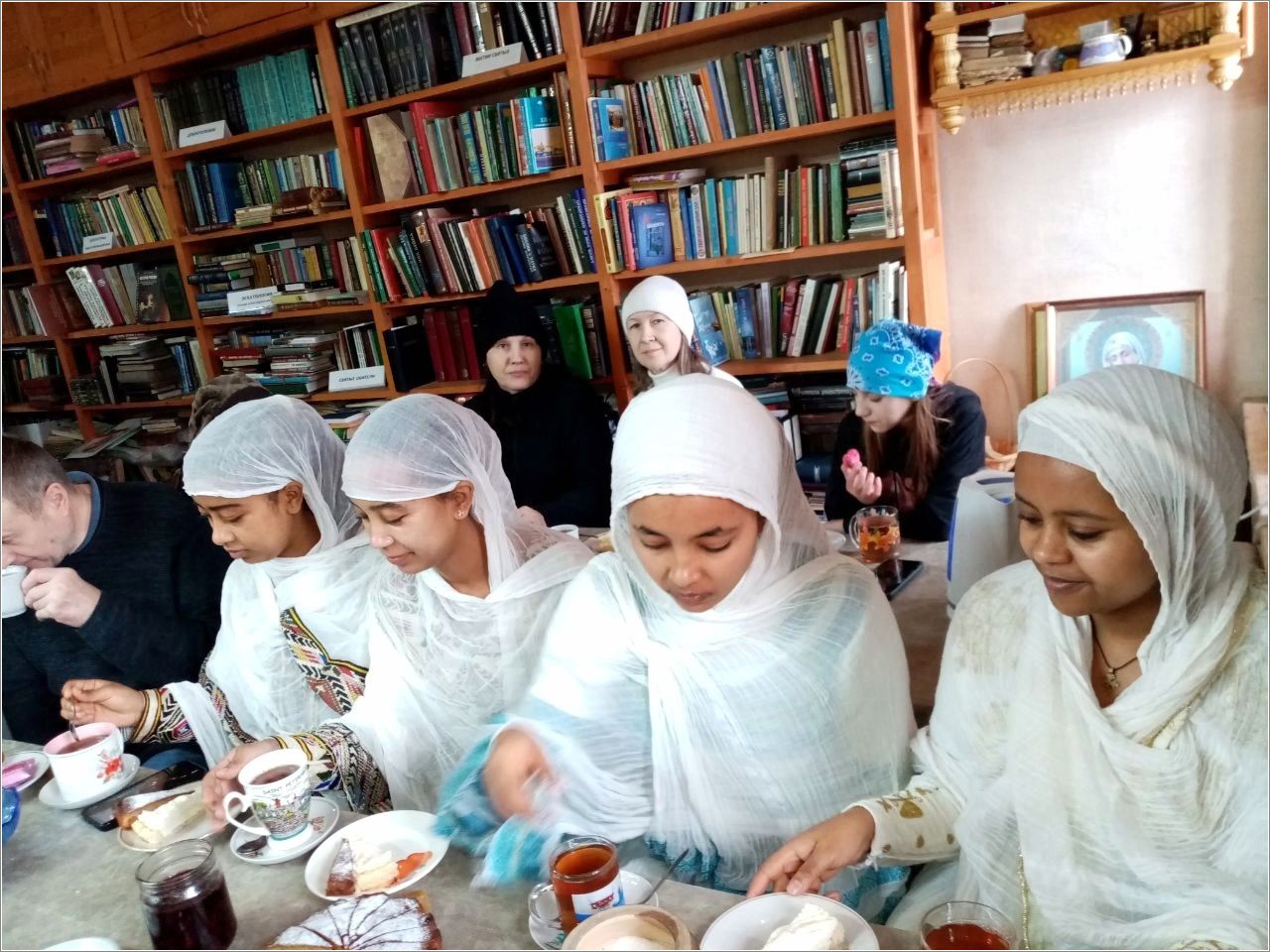Девушки работают по контракту в Елабуге. За три месяца они уже неплохо освоили русский язык — и это помогло без труда вступить в душевный разговор. При поддержке отца Сергия Пичугина прихожане с радостью пригласили гостей на чашку чая, за которой общались, делились радостью праздника. На память о встрече девушки подарили отцу Сергию иконочку с молитвой на эфиопском языке.