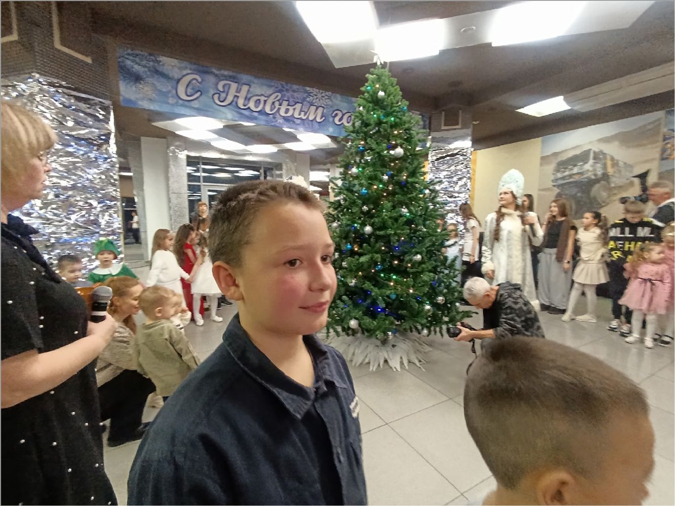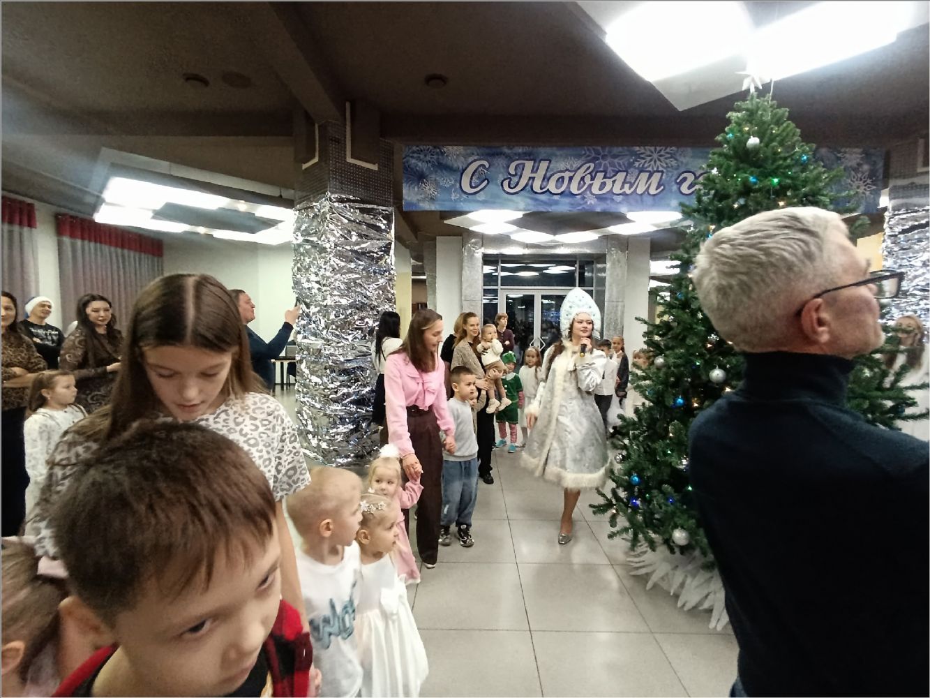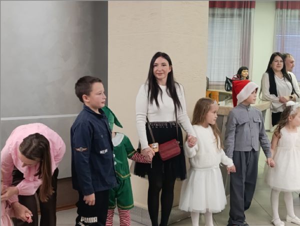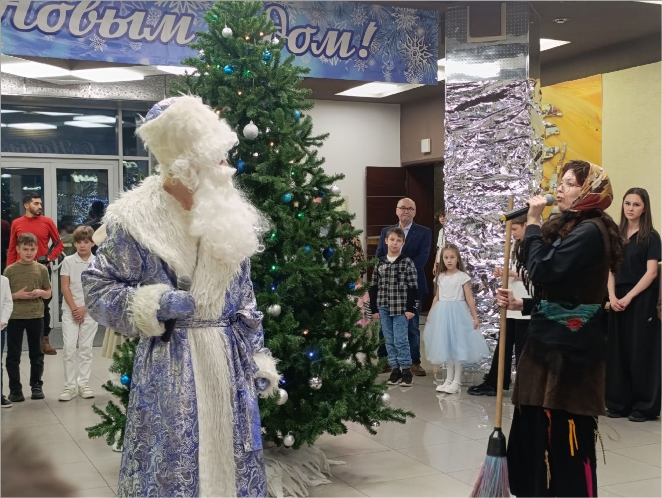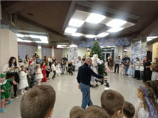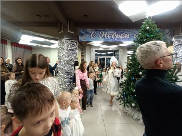 Затем для маленьких гостей состоялось представление у елки. Снегурочка уехала отдыхать, и на ее место стали пробоваться Атаманша и Баба Яга, но, конечно, они не подошли. Дед Мороз и его помощник Заяц вернули Снегурочку, и все закончилось хорошо.