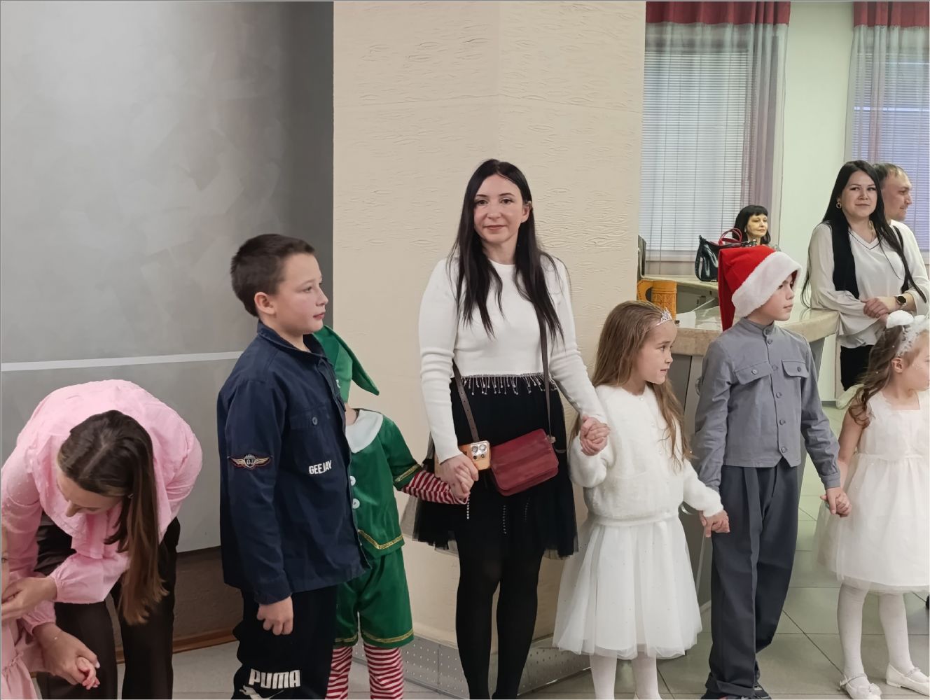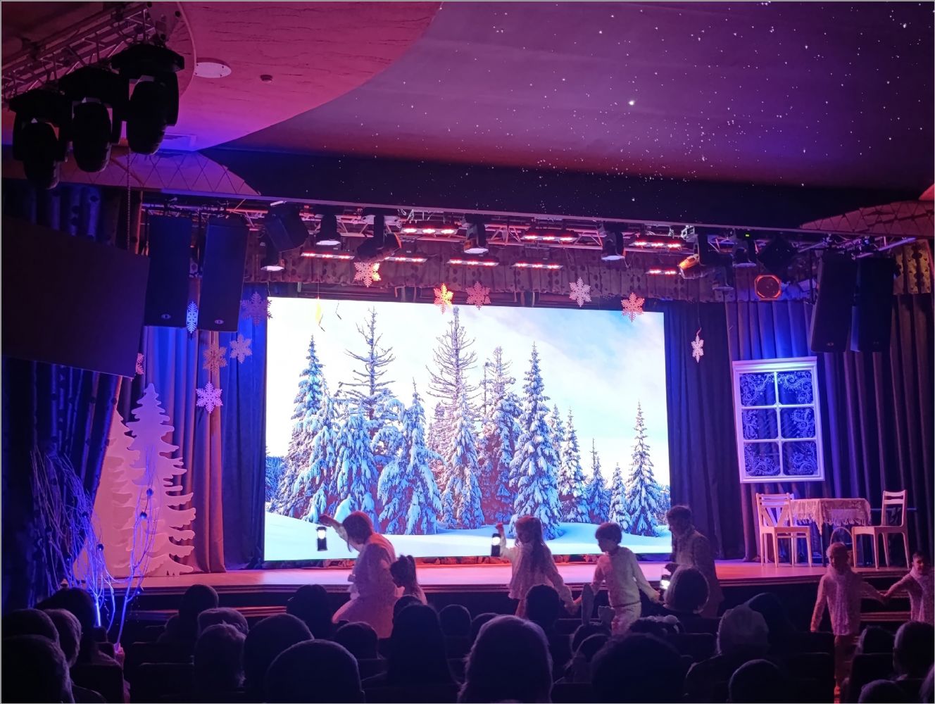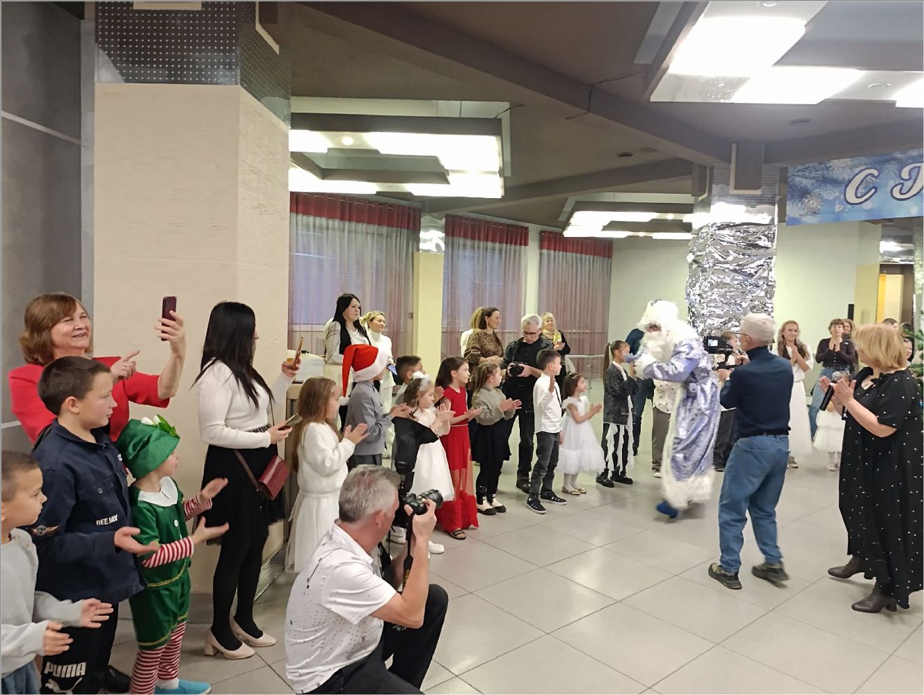 Затем для маленьких гостей состоялось представление у елки. Снегурочка уехала отдыхать, и на ее место стали пробоваться Атаманша и Баба Яга, но, конечно, они не подошли. Дед Мороз и его помощник Заяц вернули Снегурочку, и все закончилось хорошо.
