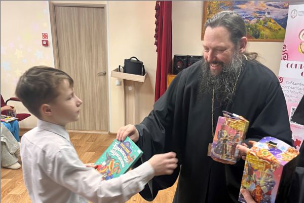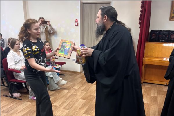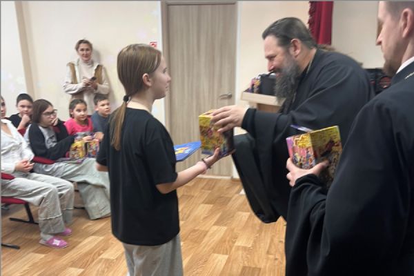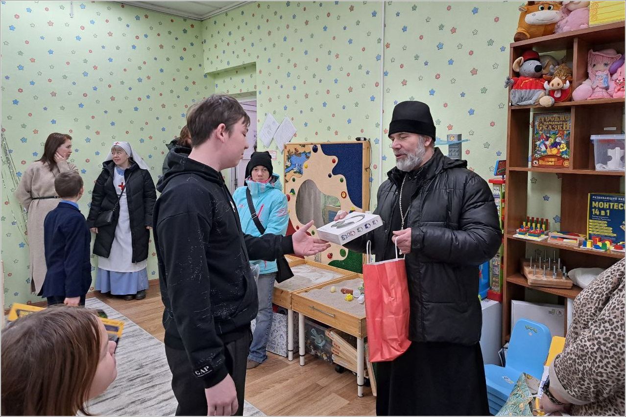 В этот же день иеромонах Амвросий (Степанюк), иерей Вячеслав Ильин и Ольга Шевелева вручили подарки детям в Комплексном центре социального обслуживания населения «Берег Надежды» для детей из семей, получающих социальные услуги в отделении социальной помощи семье и детям города Менделеевска.