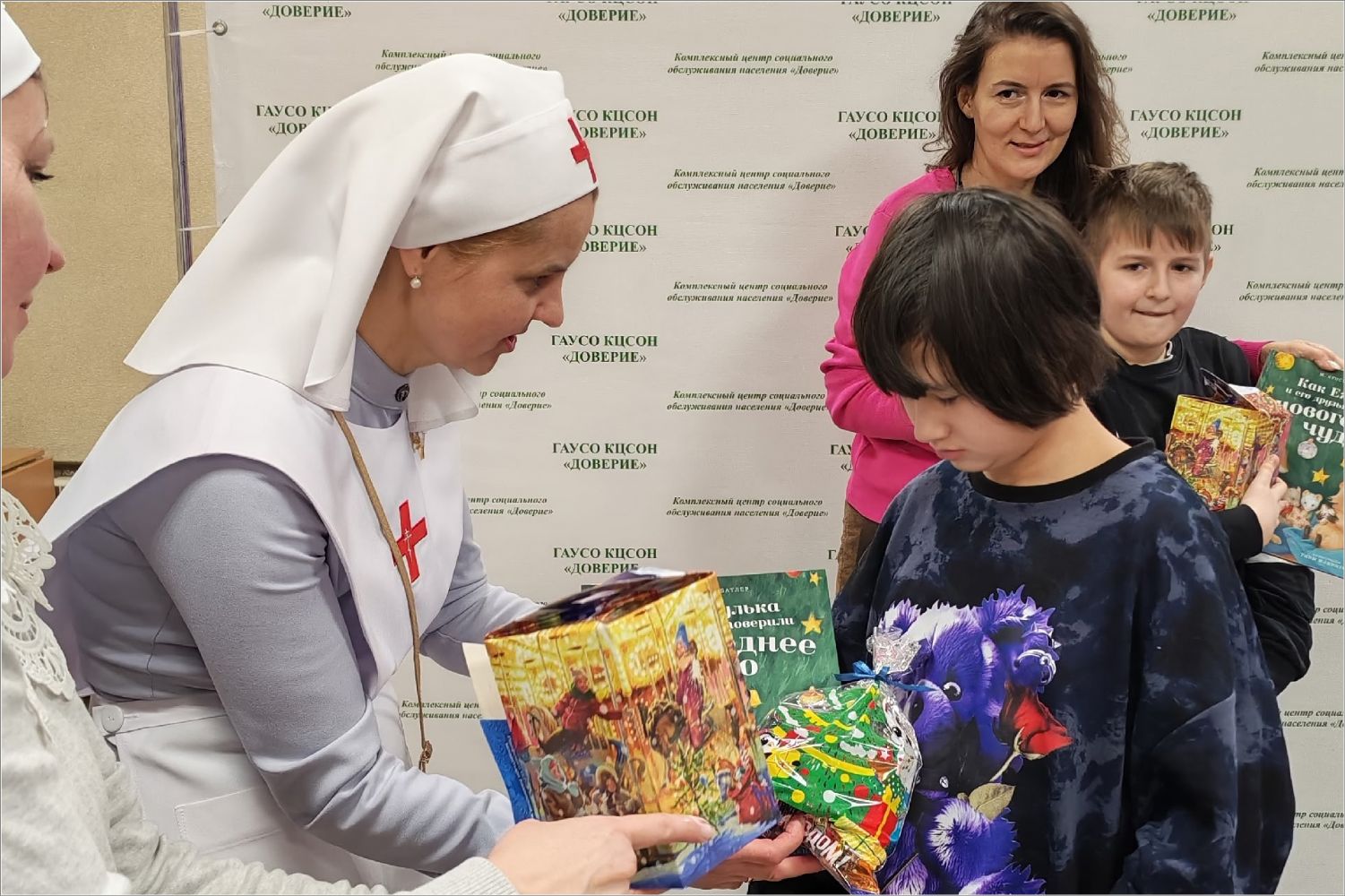 Ребята тоже принимали участие в празднике — пели песни, читали стихотворения. В конце вечера сестры милосердия вручили им подарки. Подарки достались и работникам центра социального обслуживания «Доверие» в качестве благодарности за такие нужные занятия с особенными детишками, за теплую и домашнюю атмосферу в учреждении.