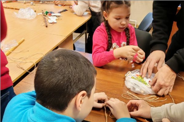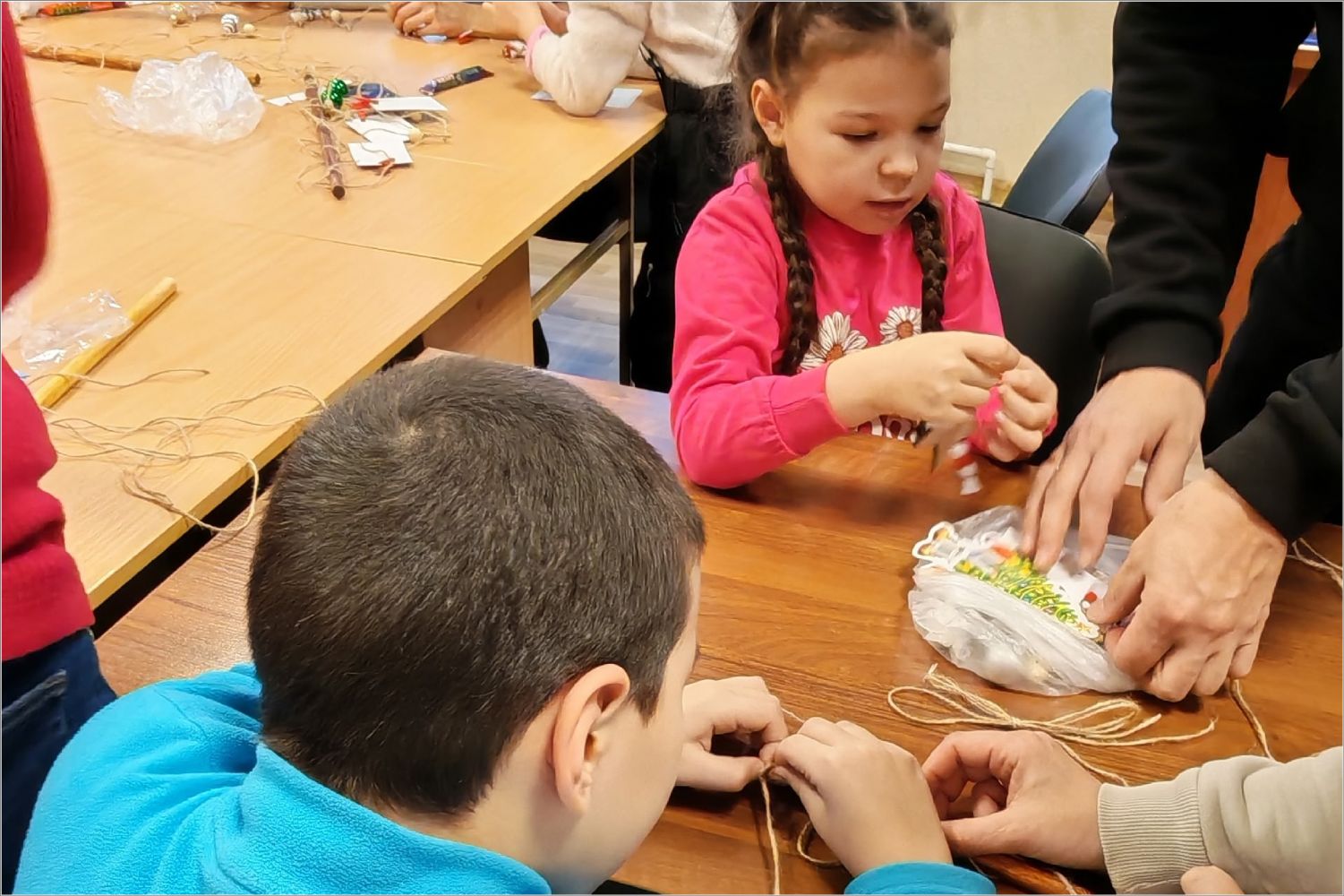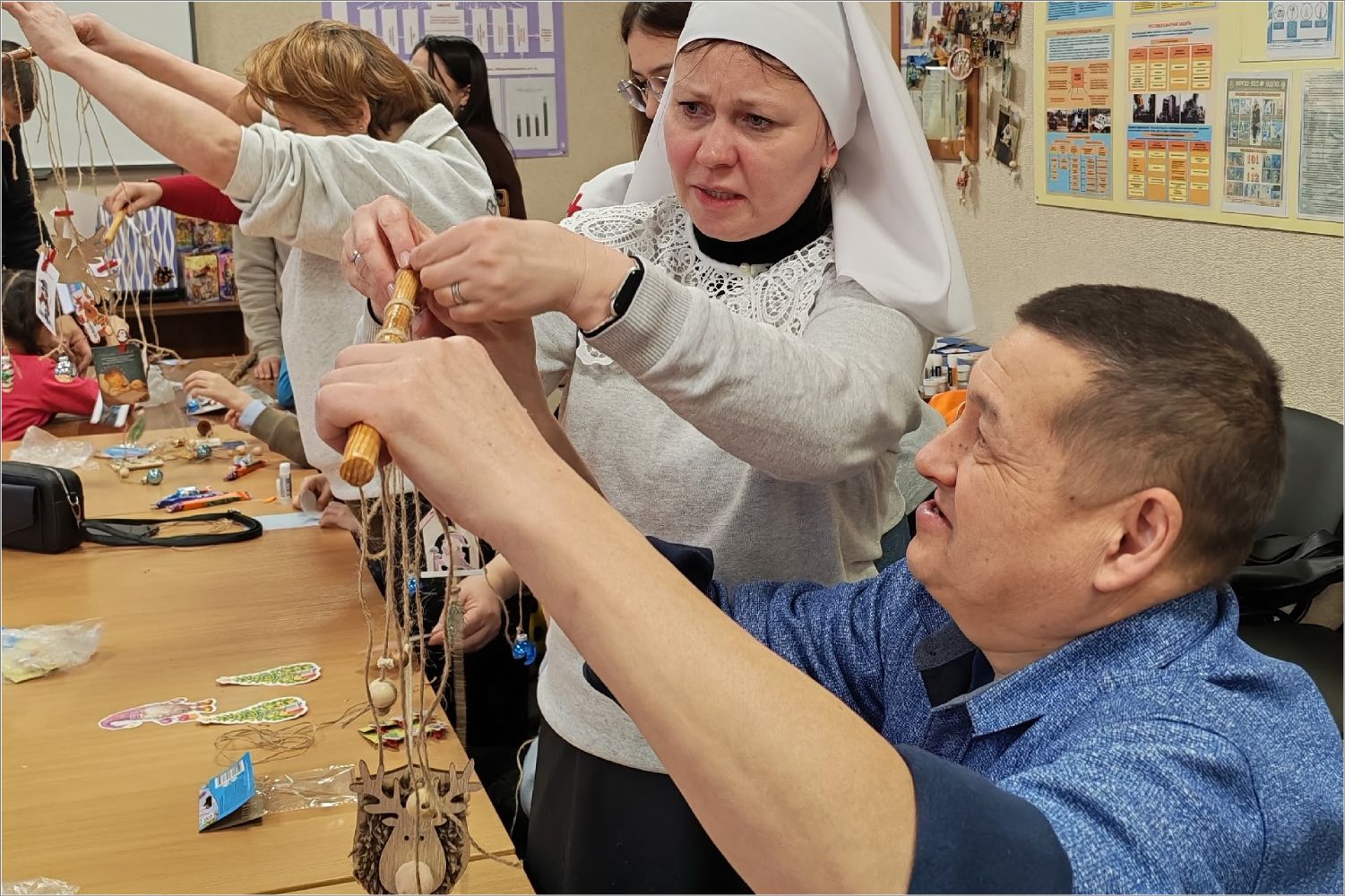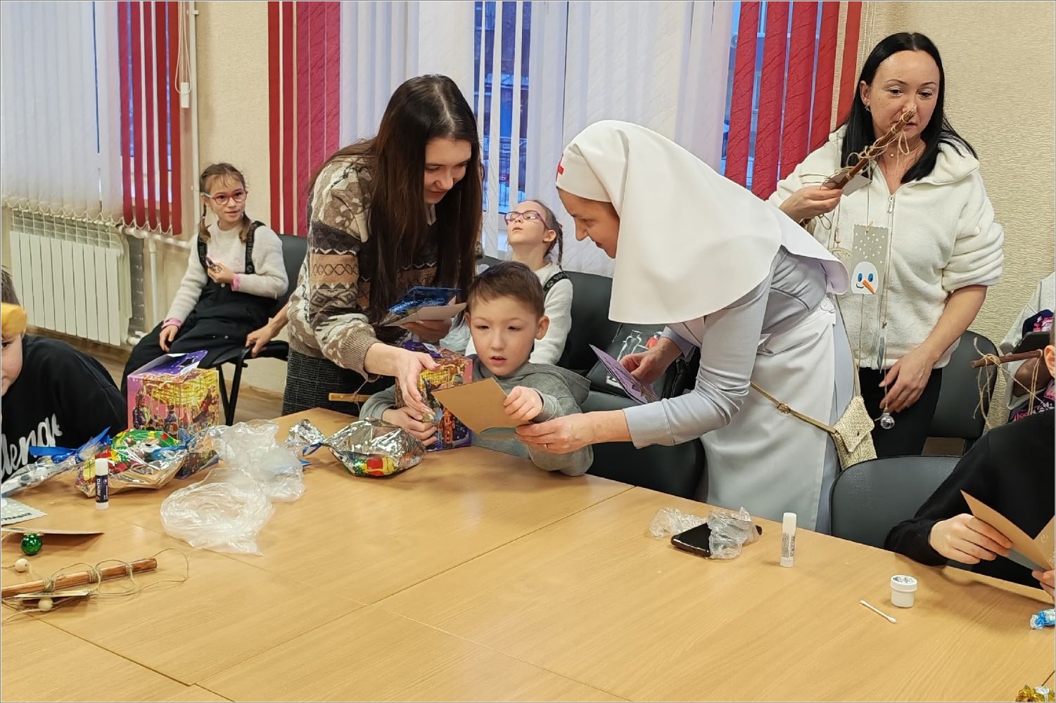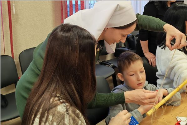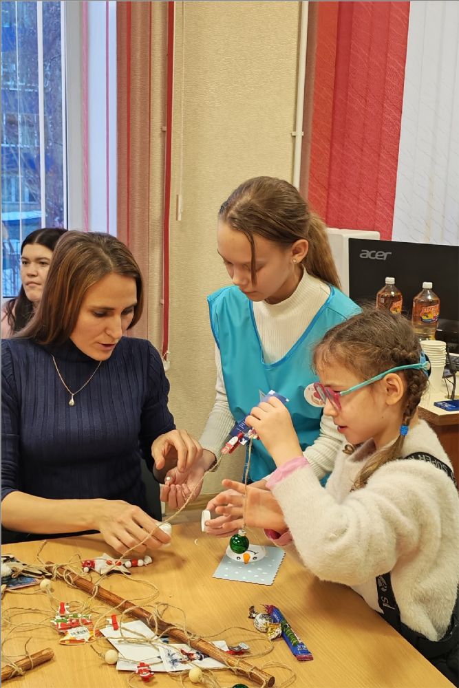 Сестры показали детям яркий детский мультфильм о Рождественском чуде, о том, что это за великий праздник и почему это такой важный день для всех. После мультфильма старшая сестра милосердия сестричества преподобномученицы инокини Варвары Алапаевской Ирина устроила викторину для закрепления полученной информации о празднике Рождества. Дети справились со всеми заданиями и были награждены призами. Потом сестры провели для ребят творческий мастер-класс по декоративным новогодним панно.