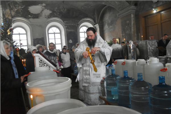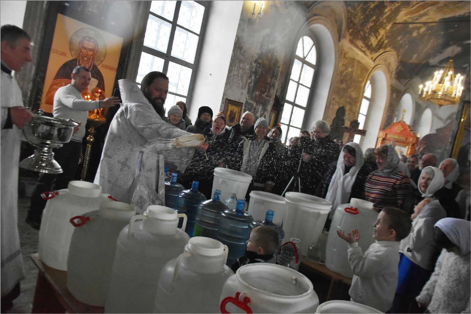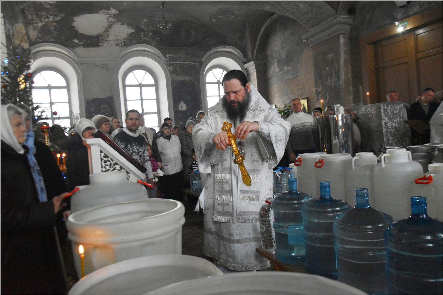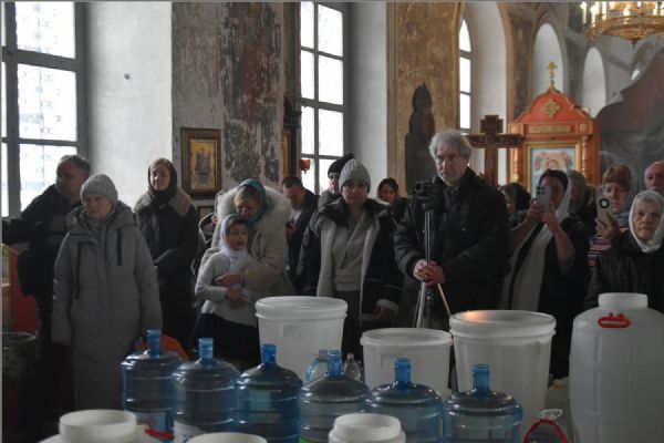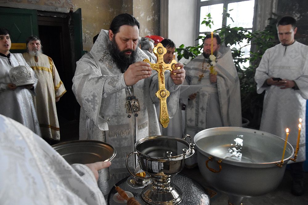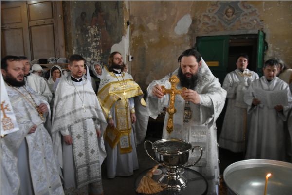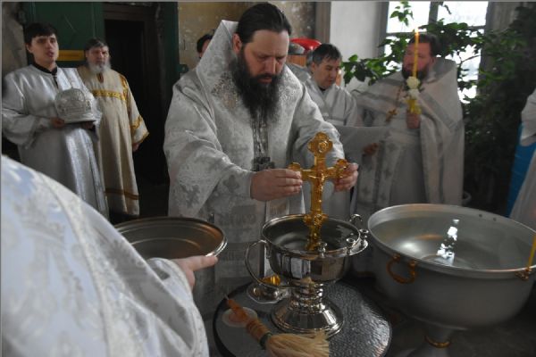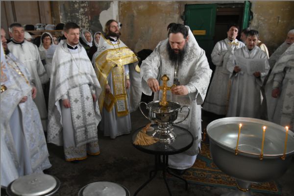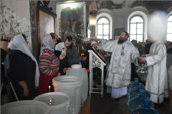 За вечерней были прочитаны 13 паримий праздника с особыми припевами. После заамвонной молитвы под пение тропаря «Глас Господень на водах многих» архипастырь изнёс из алтаря крест и совершил Великое освящение воды. После освящения владыка окропил молящихся агиасмой.