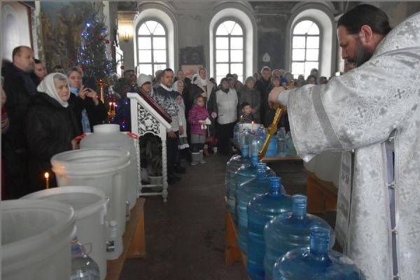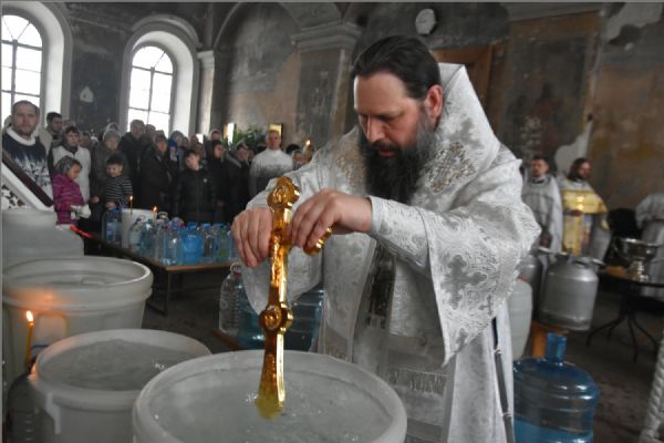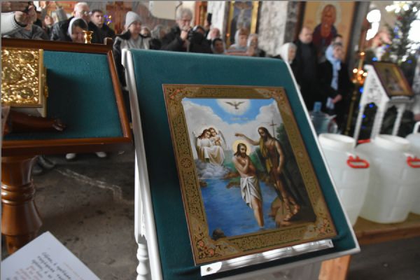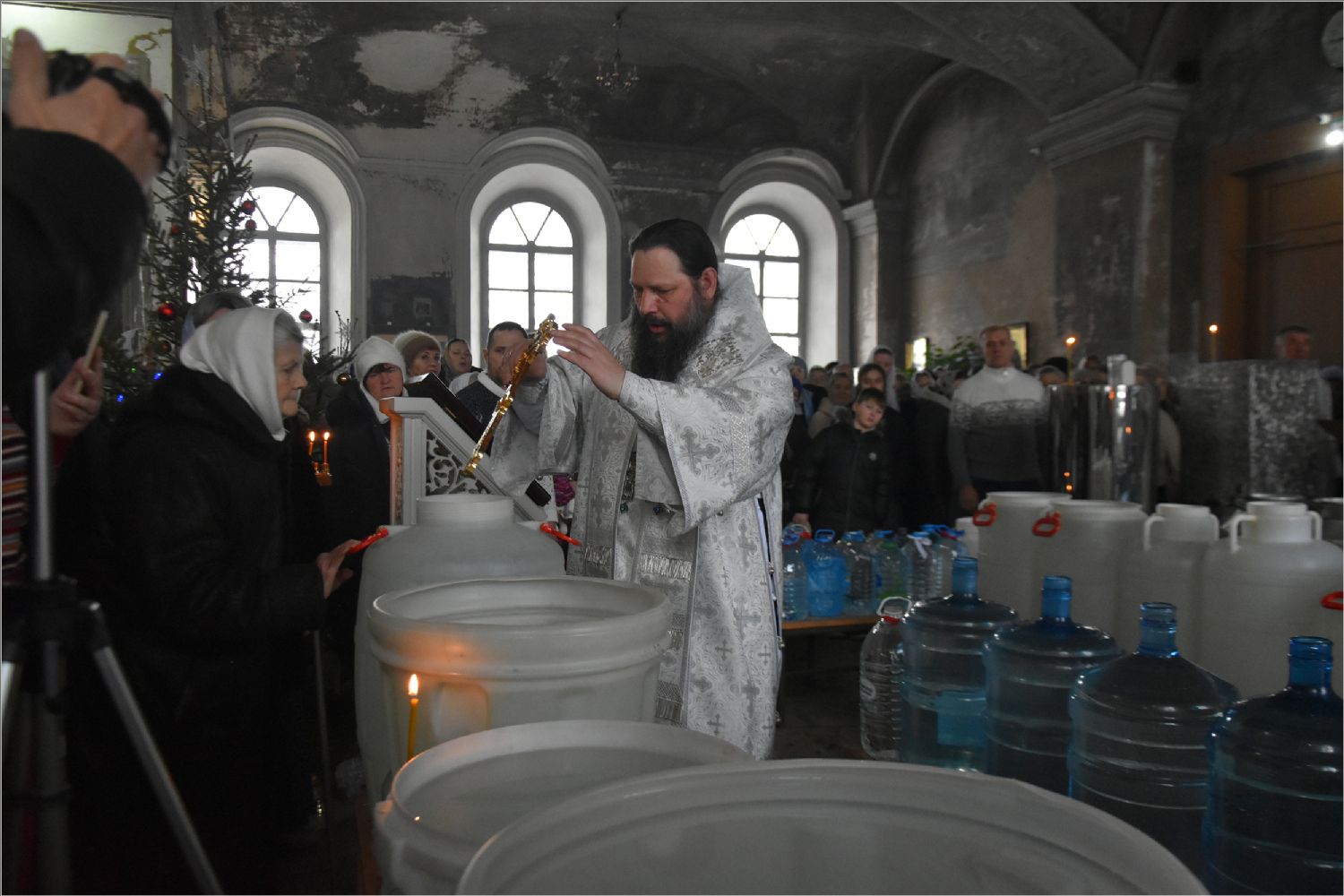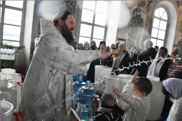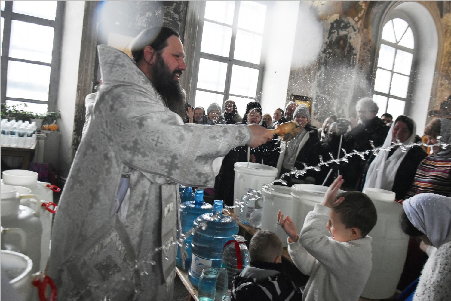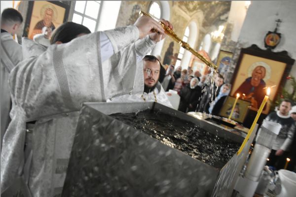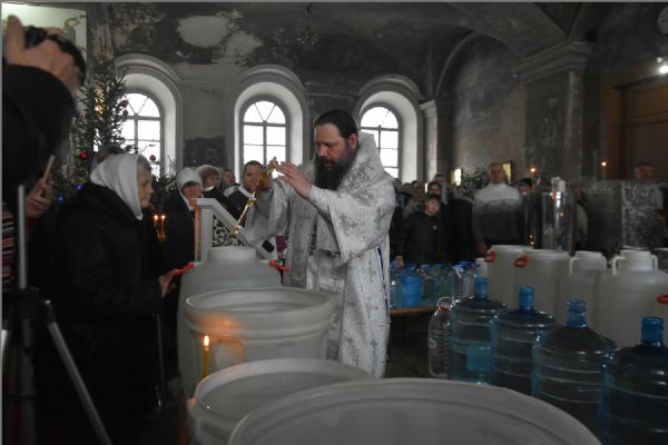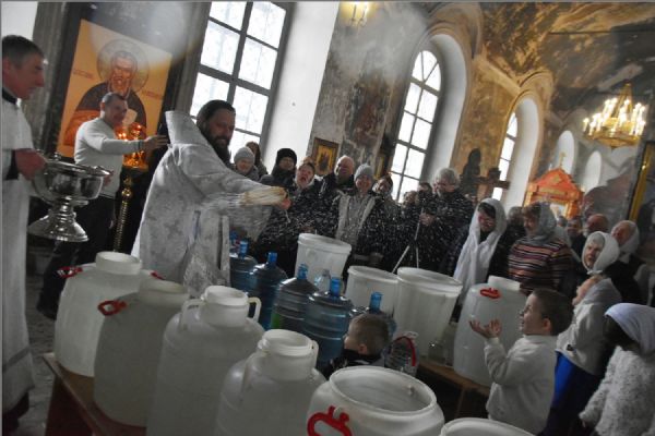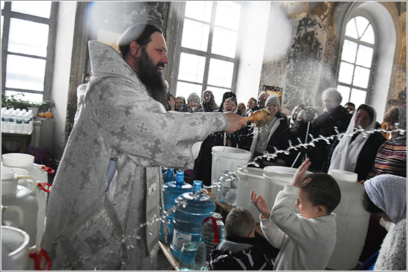 За вечерней были прочитаны 13 паримий праздника с особыми припевами. После заамвонной молитвы под пение тропаря «Глас Господень на водах многих» архипастырь изнёс из алтаря крест и совершил Великое освящение воды. После освящения владыка окропил молящихся агиасмой.