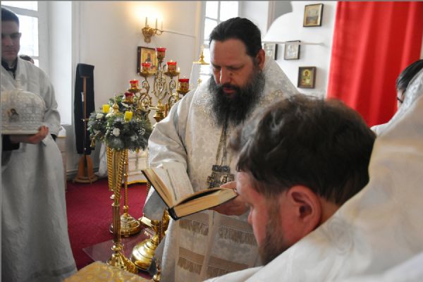 Архипастырю сослужили благочинный Елабужского округа, настоятель Спасского собора, иеромонах Кирилл (Забавнов), благочинный Закамского округа протоиерей Андрей Дубровин, настоятель храма преподобного Серафима Саровского города Набережные Челны иеромонах Амвросий (Степанюк), клирки Спасского собора иерей Михаил Климов и иерей Роман Лепихин и клирик Свято-Вознесенского кафедрального собора иерей Сергий Иноземцев. Диаконский чин возглавил протодиакон Дмитрий Половников.