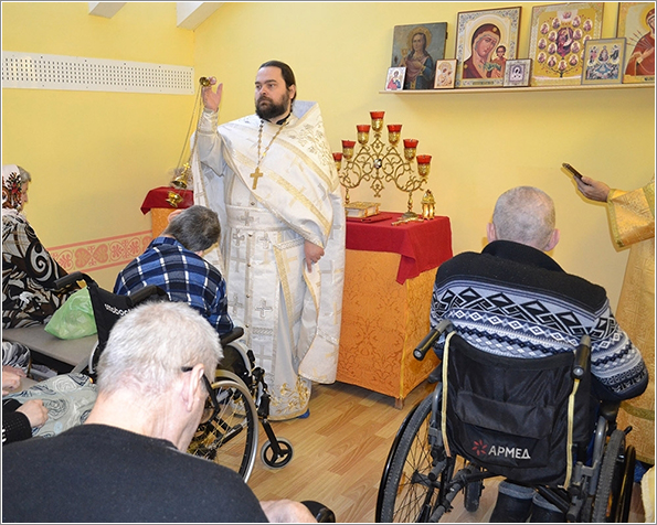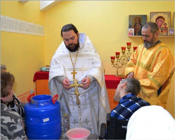 По окончании службы священник обратился к собравшимся постояльцам дома-интерната со словами проповеди, в которой рассказал о Святом Иоанне Предтече, о его жизни, о призыве к покаянию. Сестры милосердия поздравили проживающих с праздником Крещения Господня и всех угостили небольшими сладкими подарками.