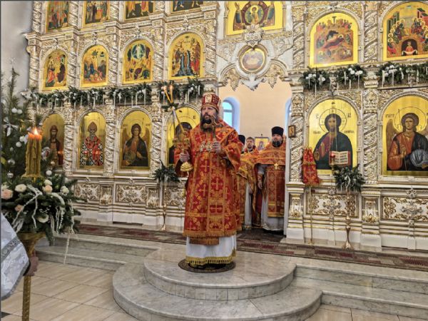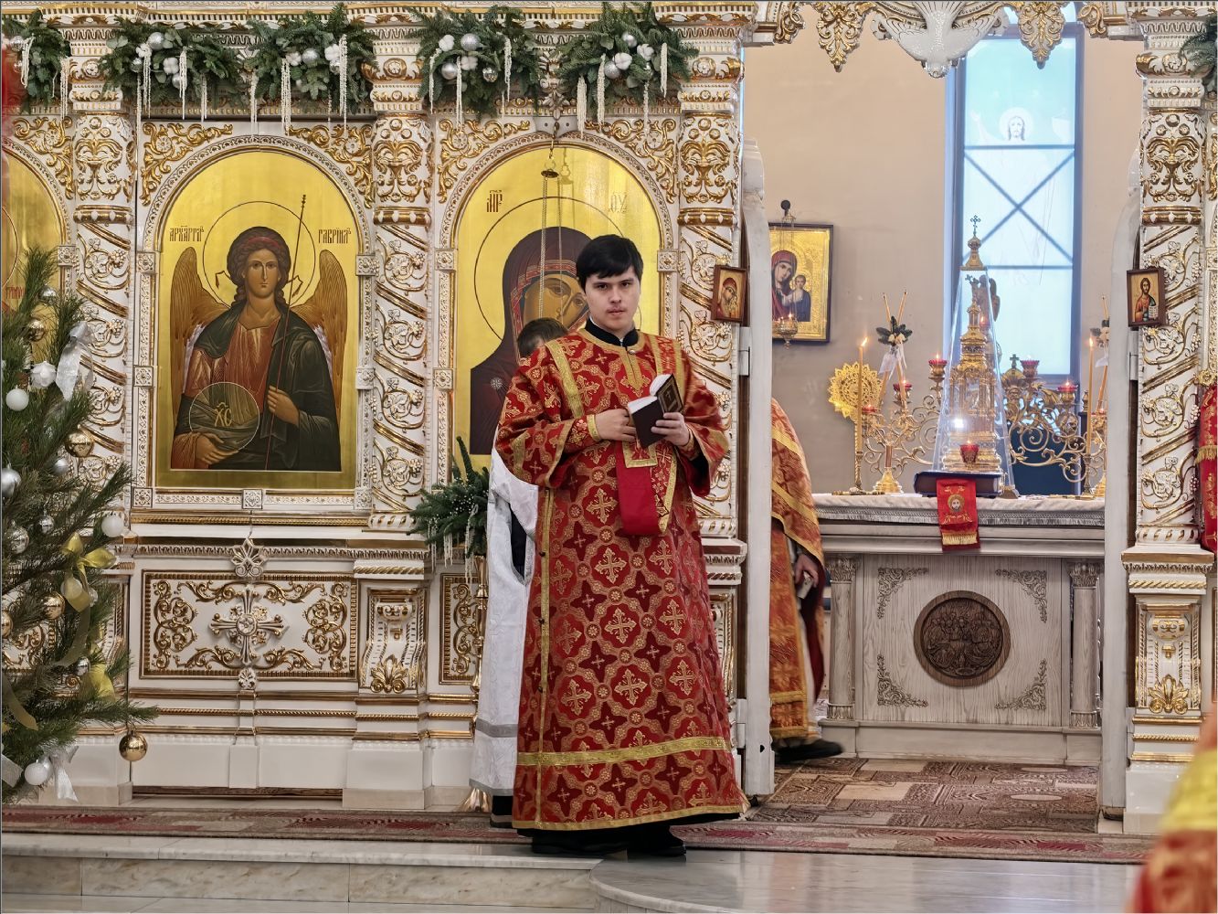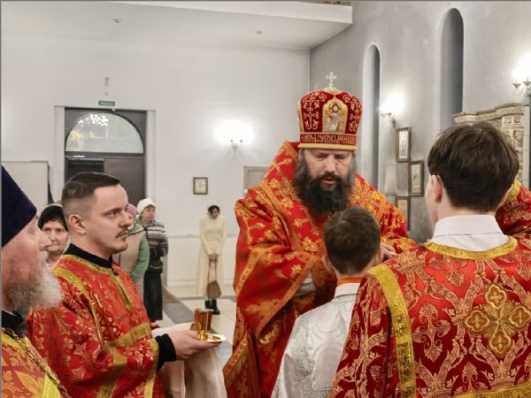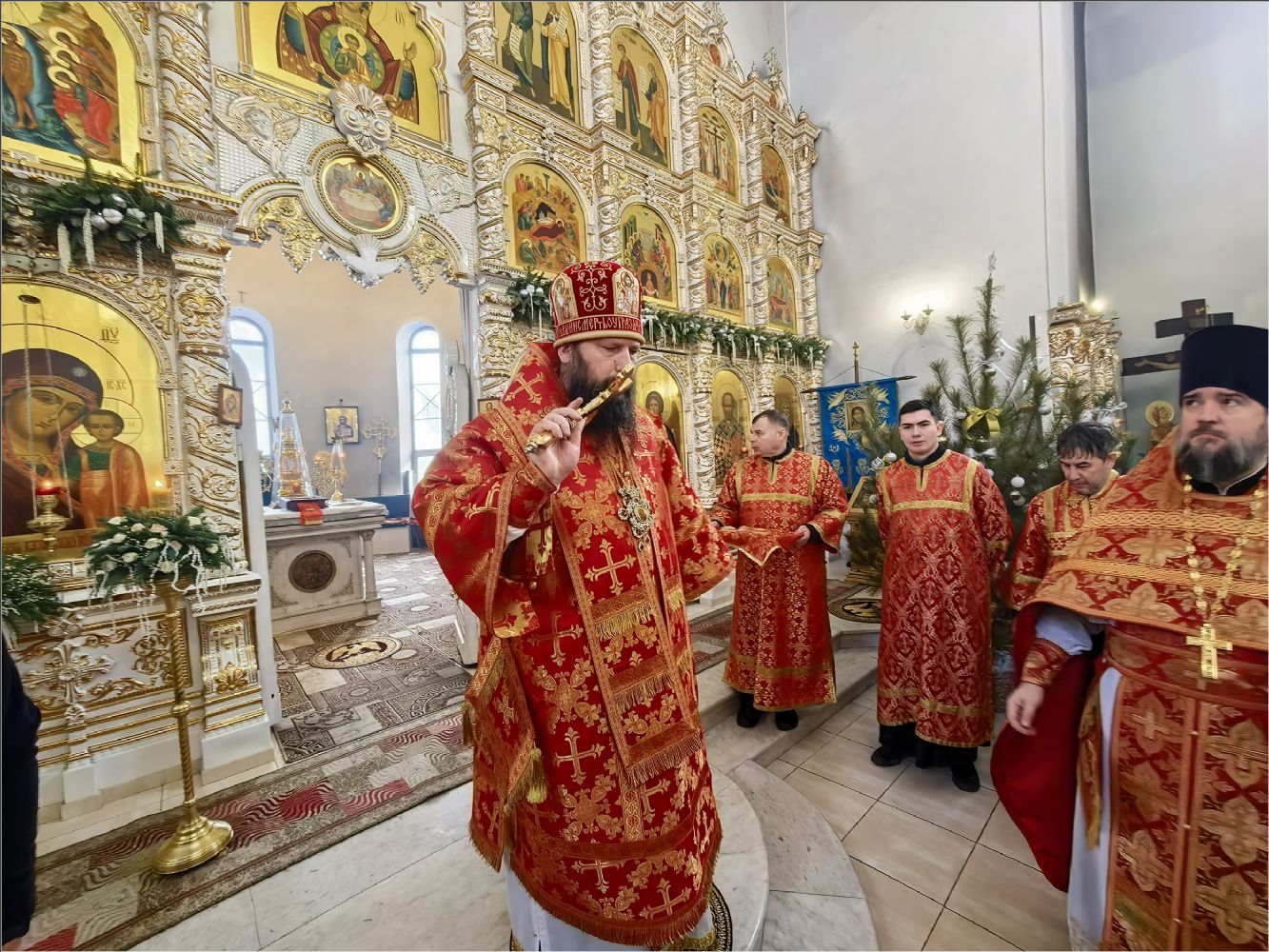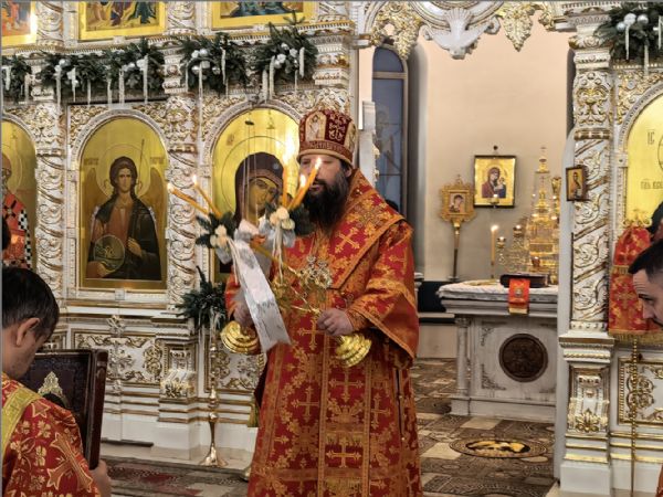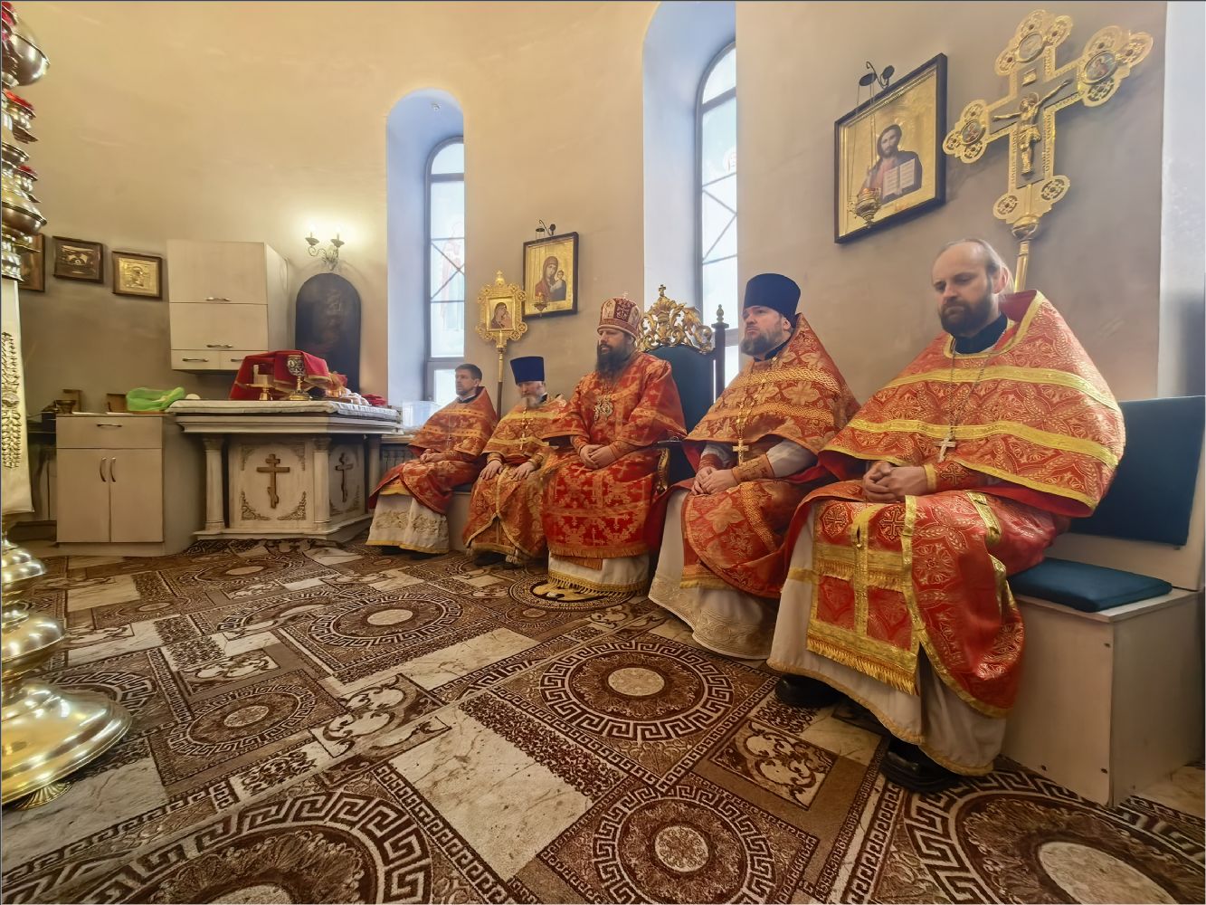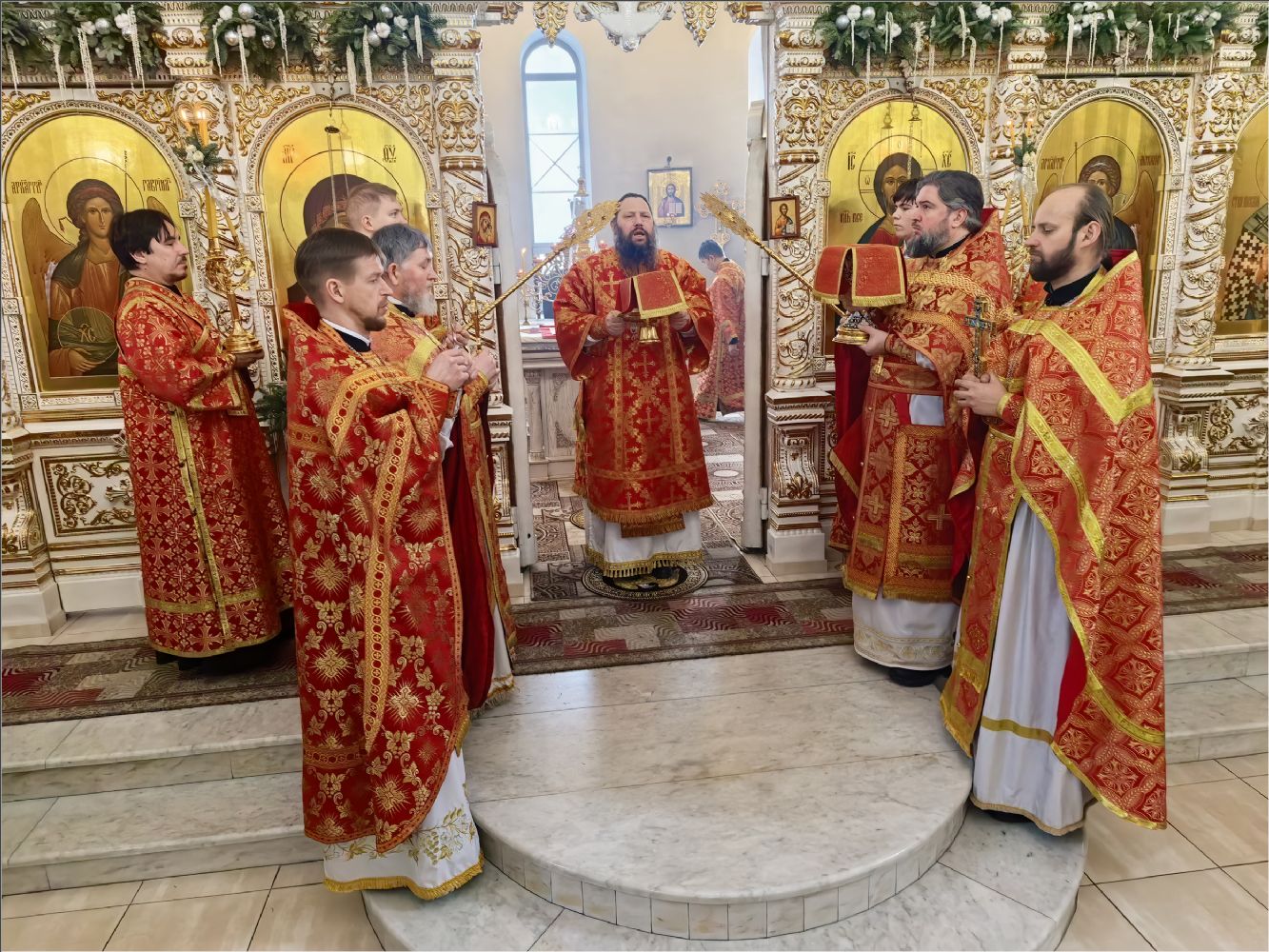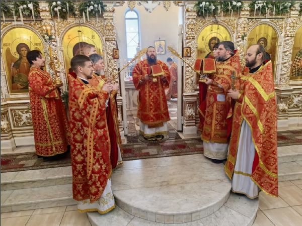 Его Преосвященству сослужили клирики Казанско-Богородицкого храма иерей Алексий Носов и иерей Иоанн Можаев и клирик Свято-Вознесенского кафедрального собора иерей Сергий Иноземцев. Диаконский чин возглавил протодиакон Дмитрий Половников.