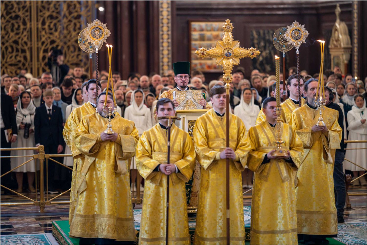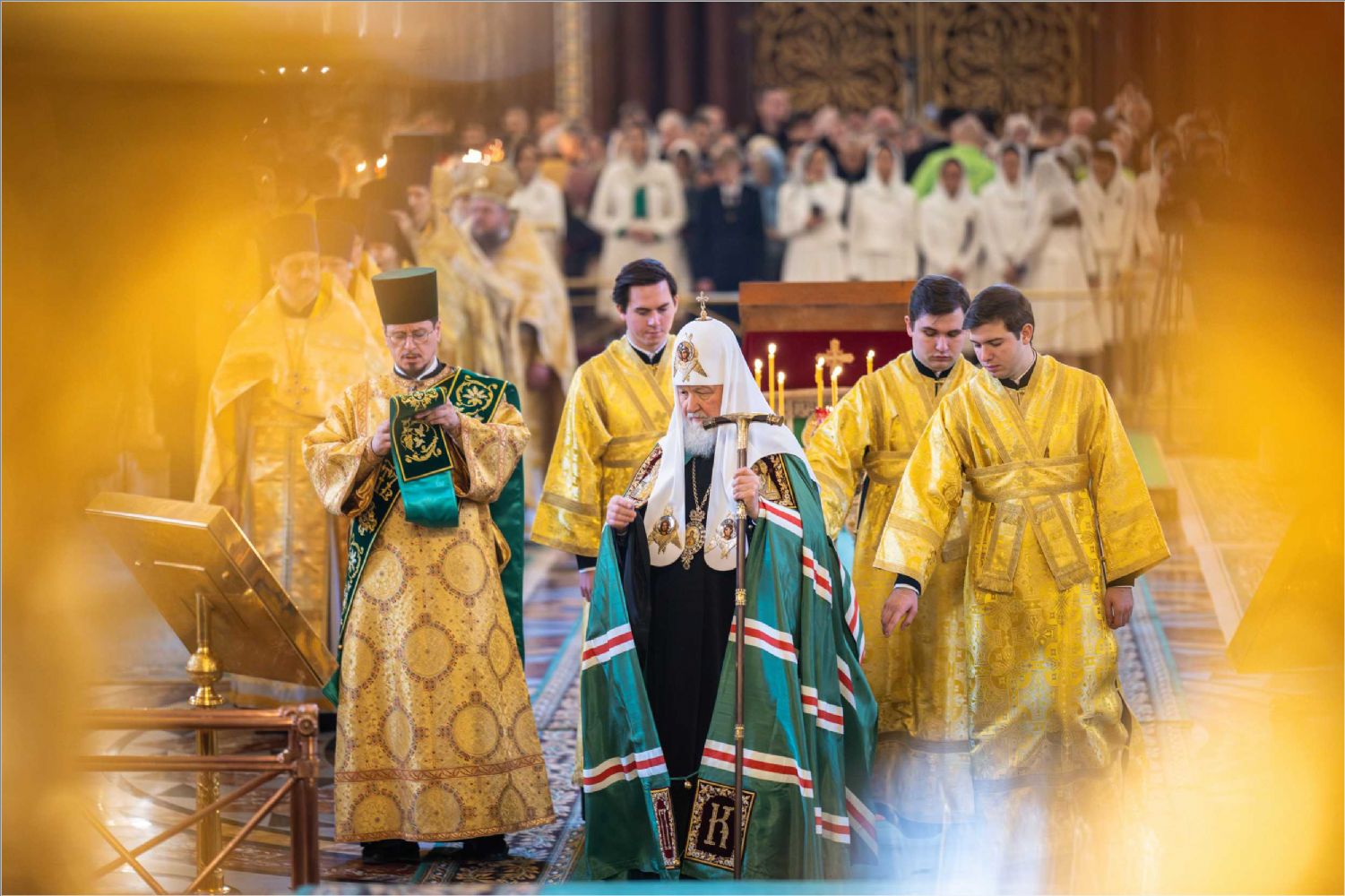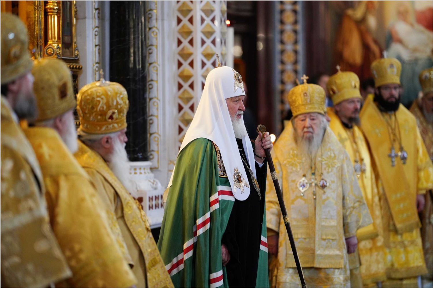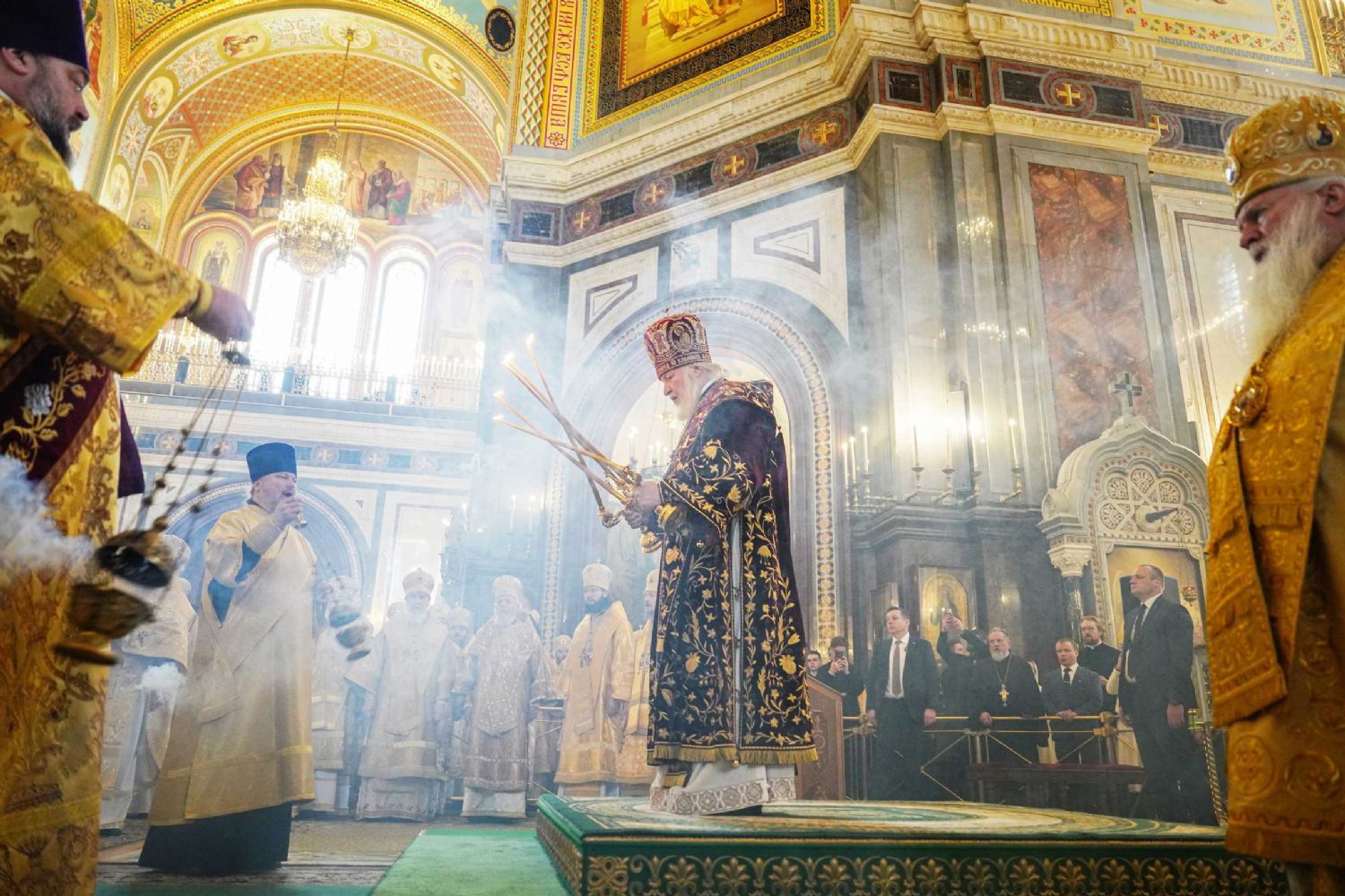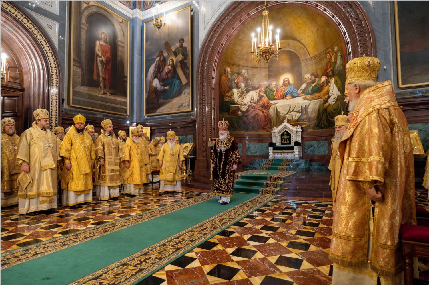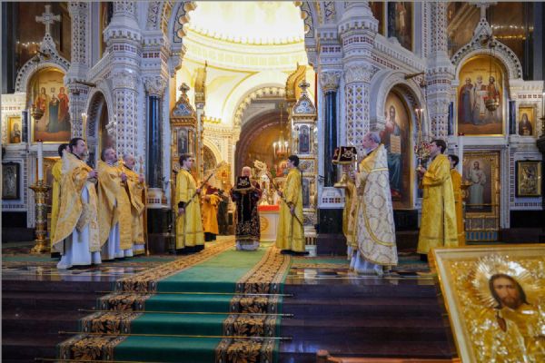 В этот знаменательный день Святейший Патриарх Кирилл совершил Божественную литургию в кафедральном соборном Храме Христа Спасителя в Москве в интронизационных облачениях и с копией жезла святителя Петра.