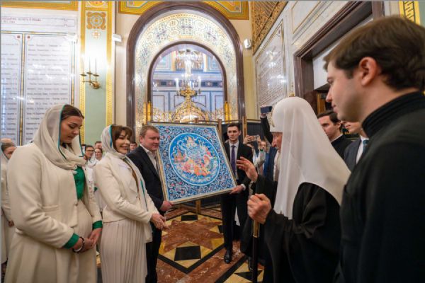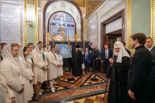 В галерее Храма Христа Спасителя Предстоятеля Русской Церкви поздравили участники движения «Патриаршие добровольцы».