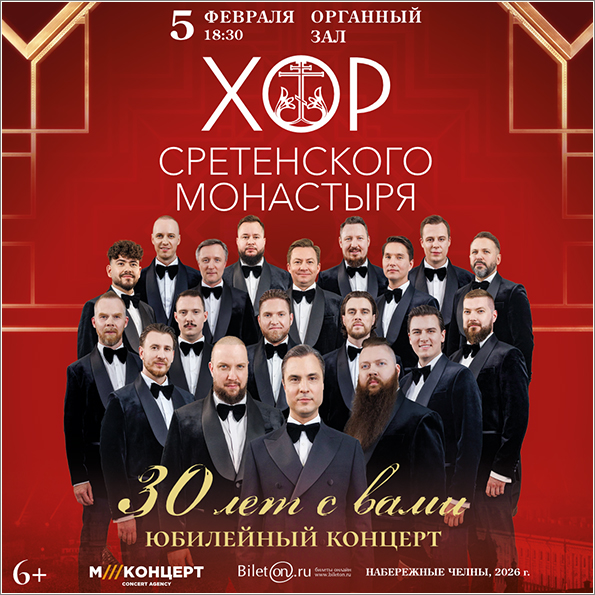 5 февраля в 18:30 в Органном зале города Набережные Челны пройдет юбилейный концерт Хора Сретенского монастыря в рамках тура, посвященного 30-летию коллектива.