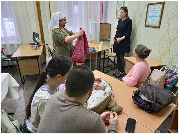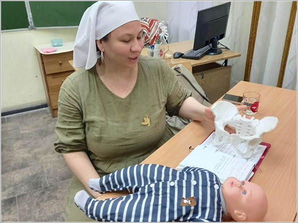 Первое занятие было посвящено физиологии беременности, во время которого слушательницы узнали, что этот период — не просто ожидание, а активная подготовка души и тела, что эмоции, мысли и состояние женщины способны непосредственно повлиять на маленького человека. Кроме этого, кандидат в сестры милосердия и ведущая курсов Иоанна научила слушателей навыкам слингоношения — базовым намоткам, которые подарят комфорт маме и малышу.