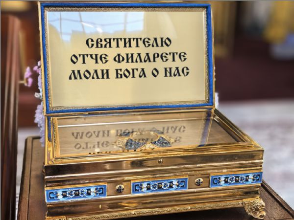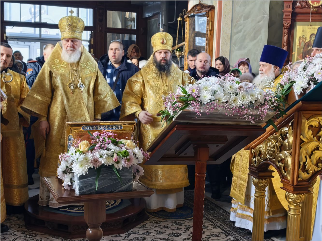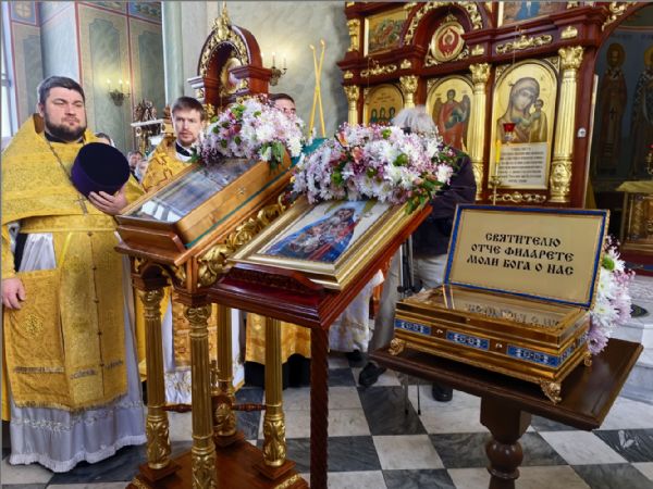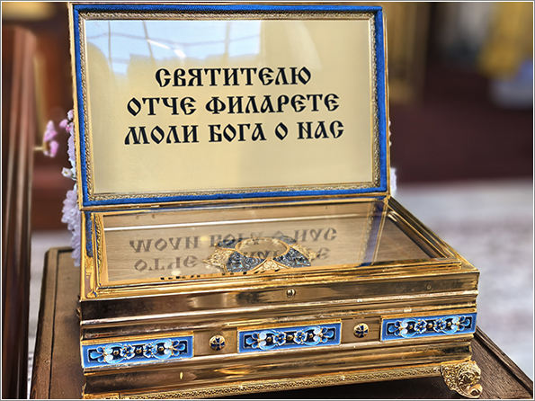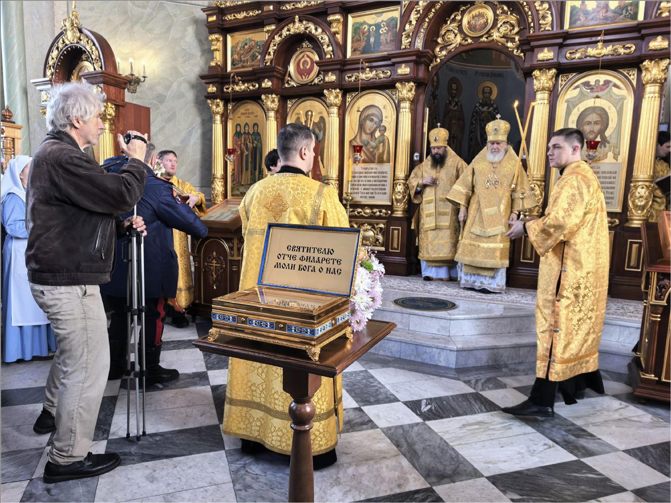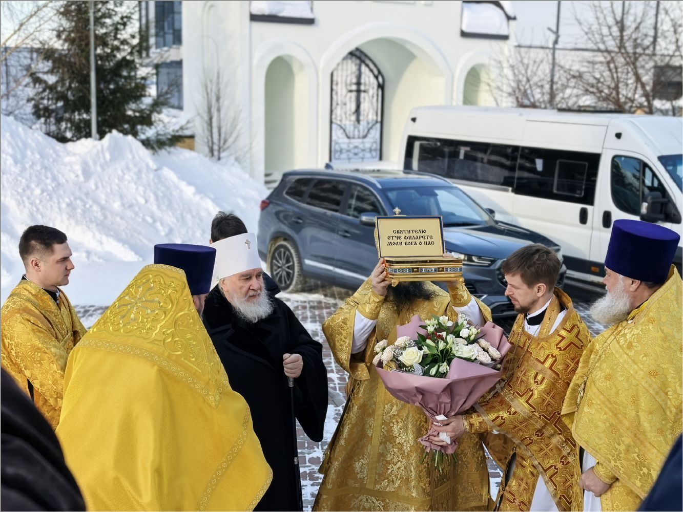 Перед началом Литургии в храм для молитвенного поклонения верующих был принесён ковчег с частицей мощей святителя Филарета, митрополита Московского, доставленный в Набережные Челны в рамках книжной выставки‑форума «Радость Слова».