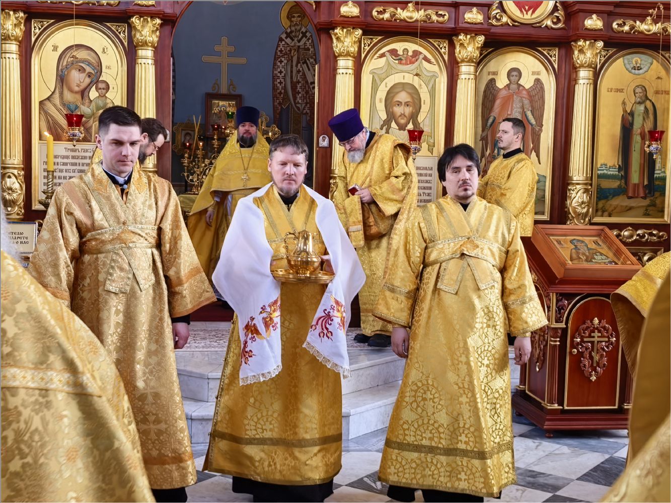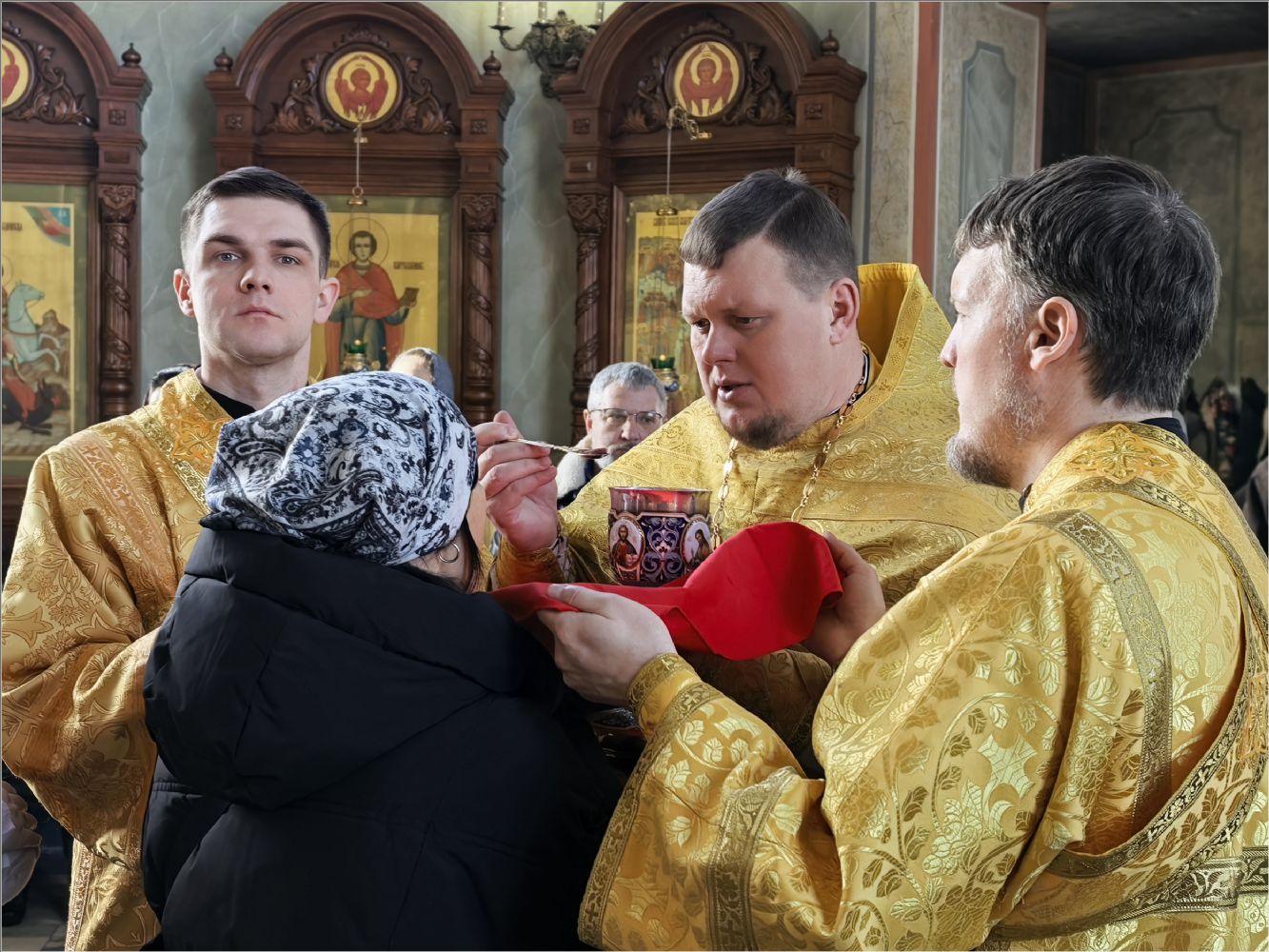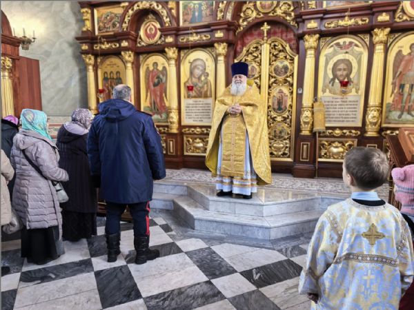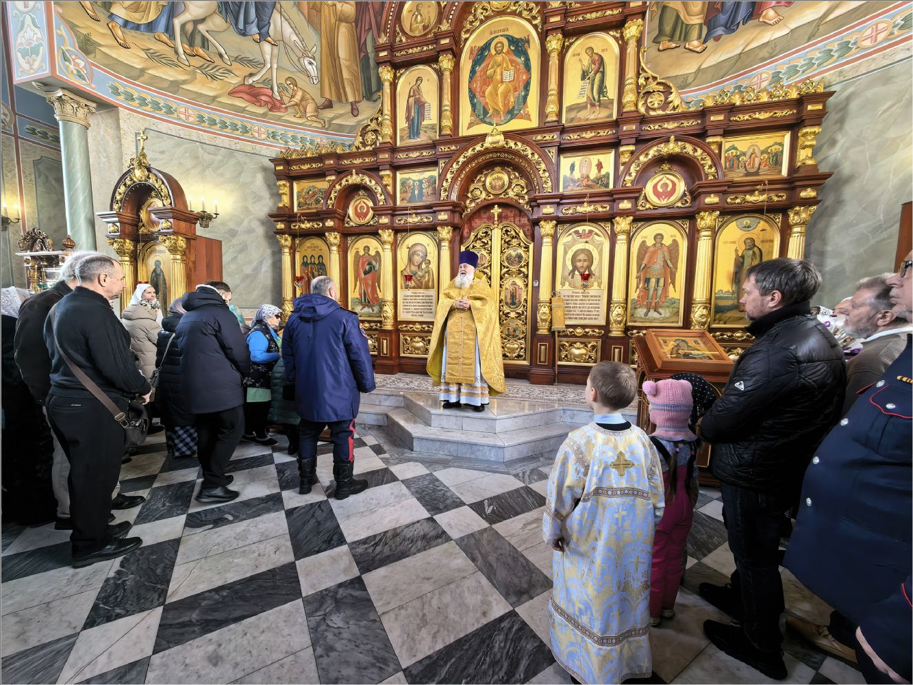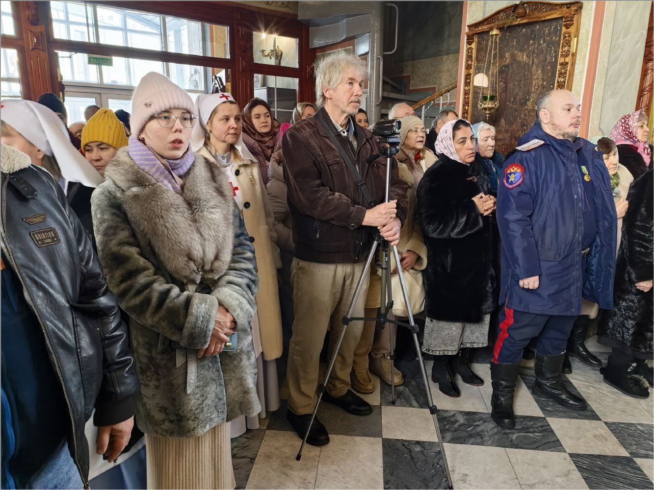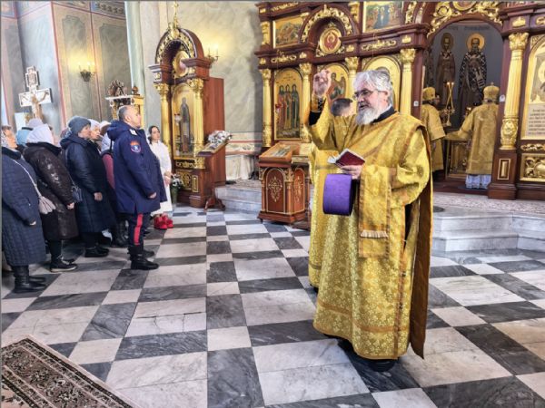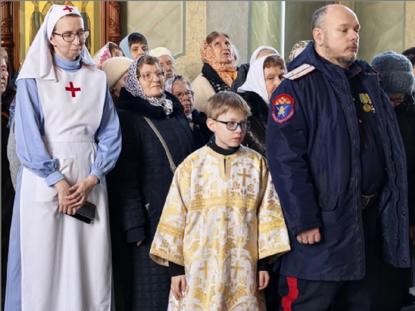 На мирной и сугубой ектениях были вознесены молитвы о Российском воинстве и о мире. Проповедь после запричастного стиха произнёс протоиерей Андрей Дубровин.