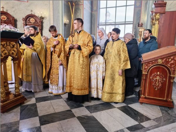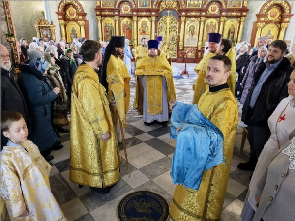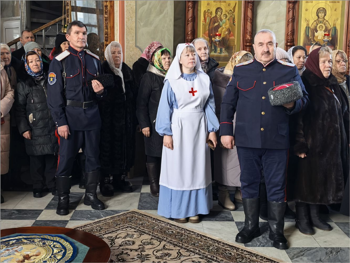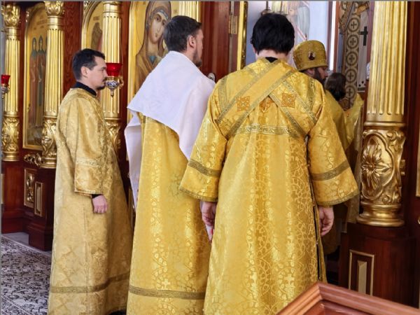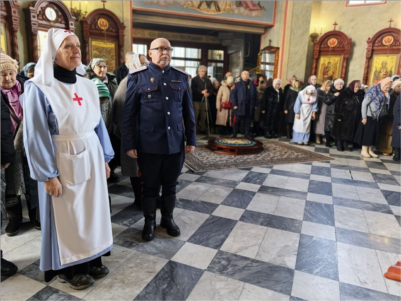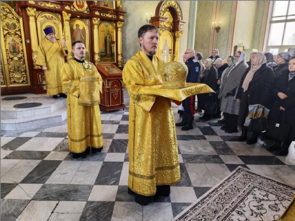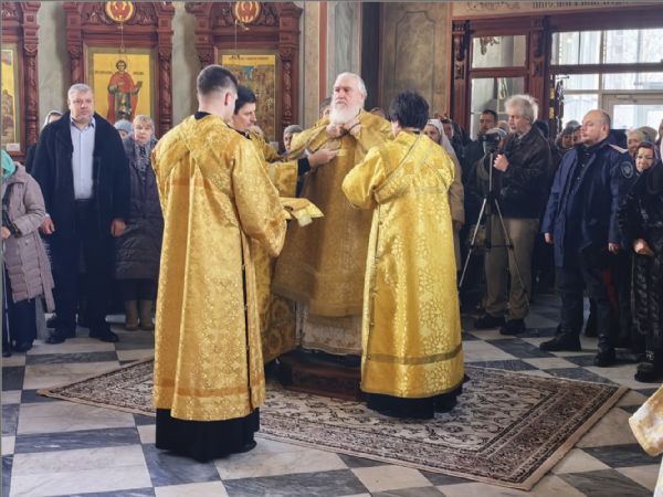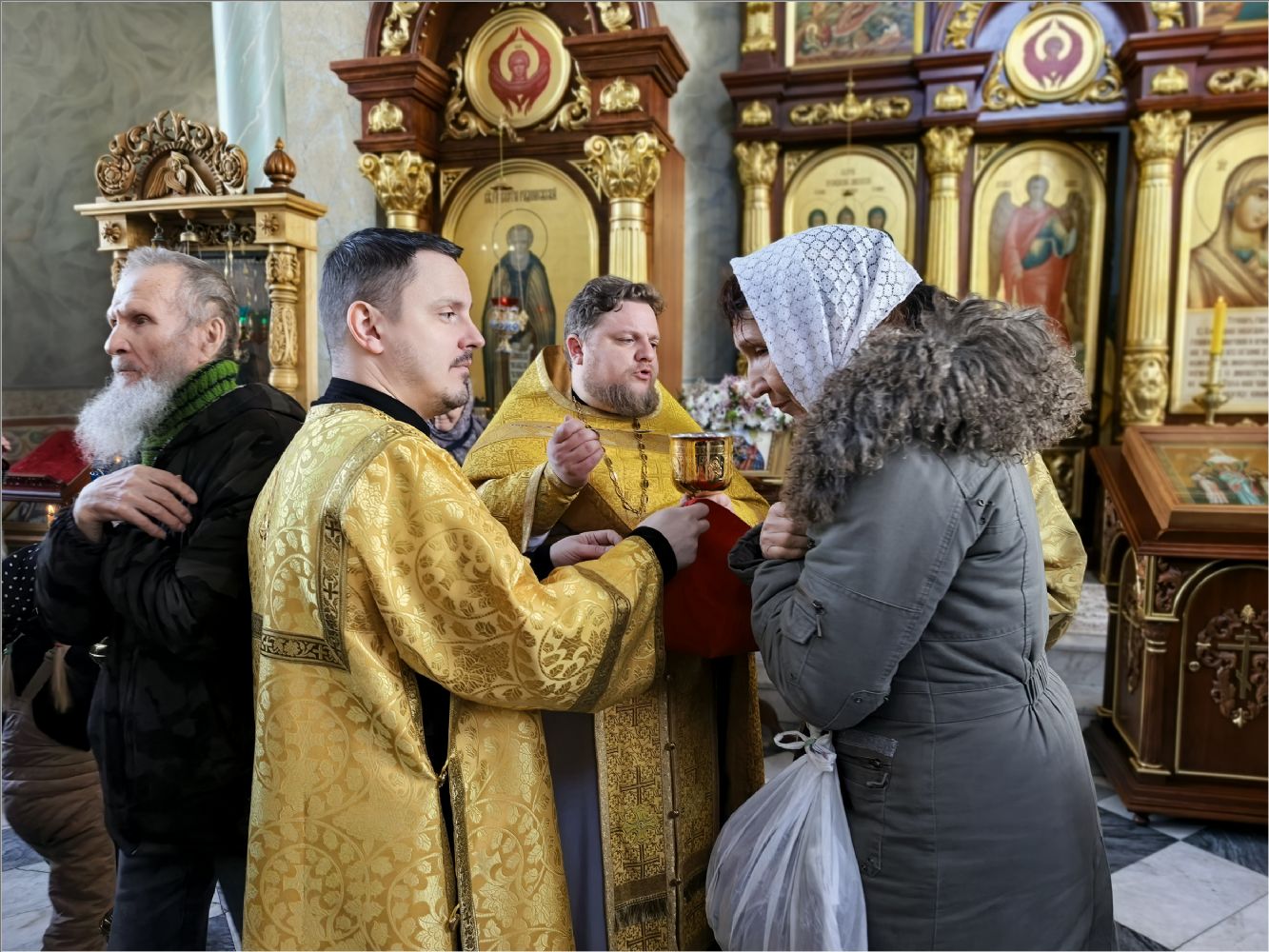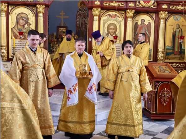 На мирной и сугубой ектениях были вознесены молитвы о Российском воинстве и о мире. Проповедь после запричастного стиха произнёс протоиерей Андрей Дубровин.