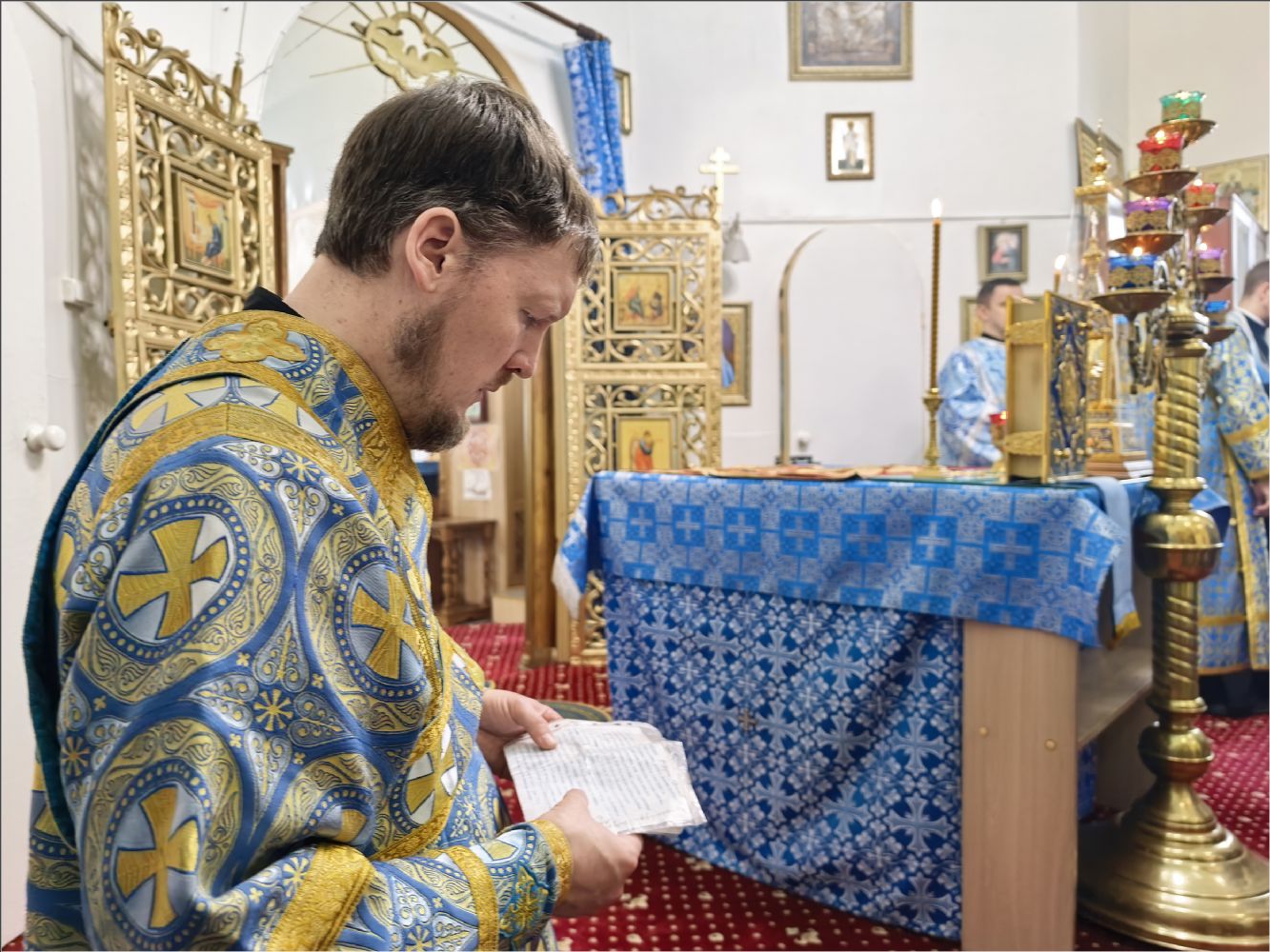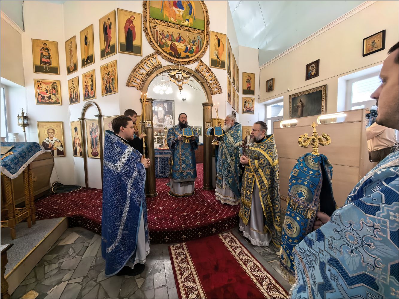 Его Преосвященству сослужили благочинный Закамского округа протоиерей Андрей Дубровин, настоятель храма великомученика Георгия Победоносца города Набережные Челны протоиерей Валерий Каранаев, настоятель храма святителя Тихона города Набережные Челны иерей Дионисий Васильев, клирик Свято‑Вознесенского кафедрального собора иерей Сергий Иноземцев. Диаконский чин возглавил протодиакон Дмитрий Половников. Песнопения исполнил приходской хор под управлением Елены Есауленко.