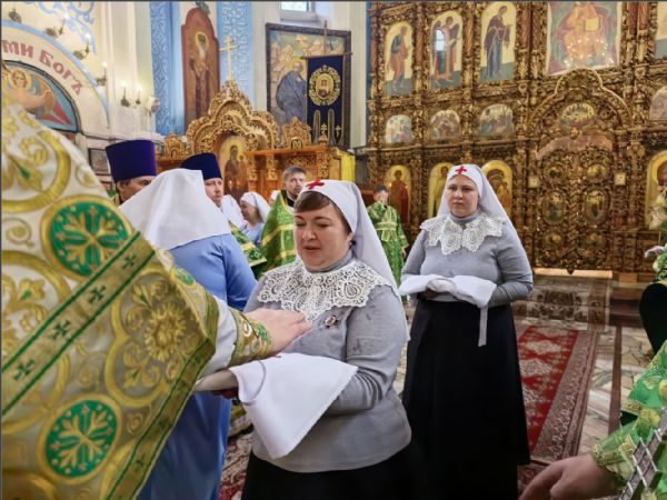 После облачения архиерея, епископ Гавриил совершил молебное пение с чтением молитв, окропил одежды сестрер милосердия и посвятил в сестры, братья и кандидатов в сестры милосердия для трех сестричеств Набережночелнинской епархии.