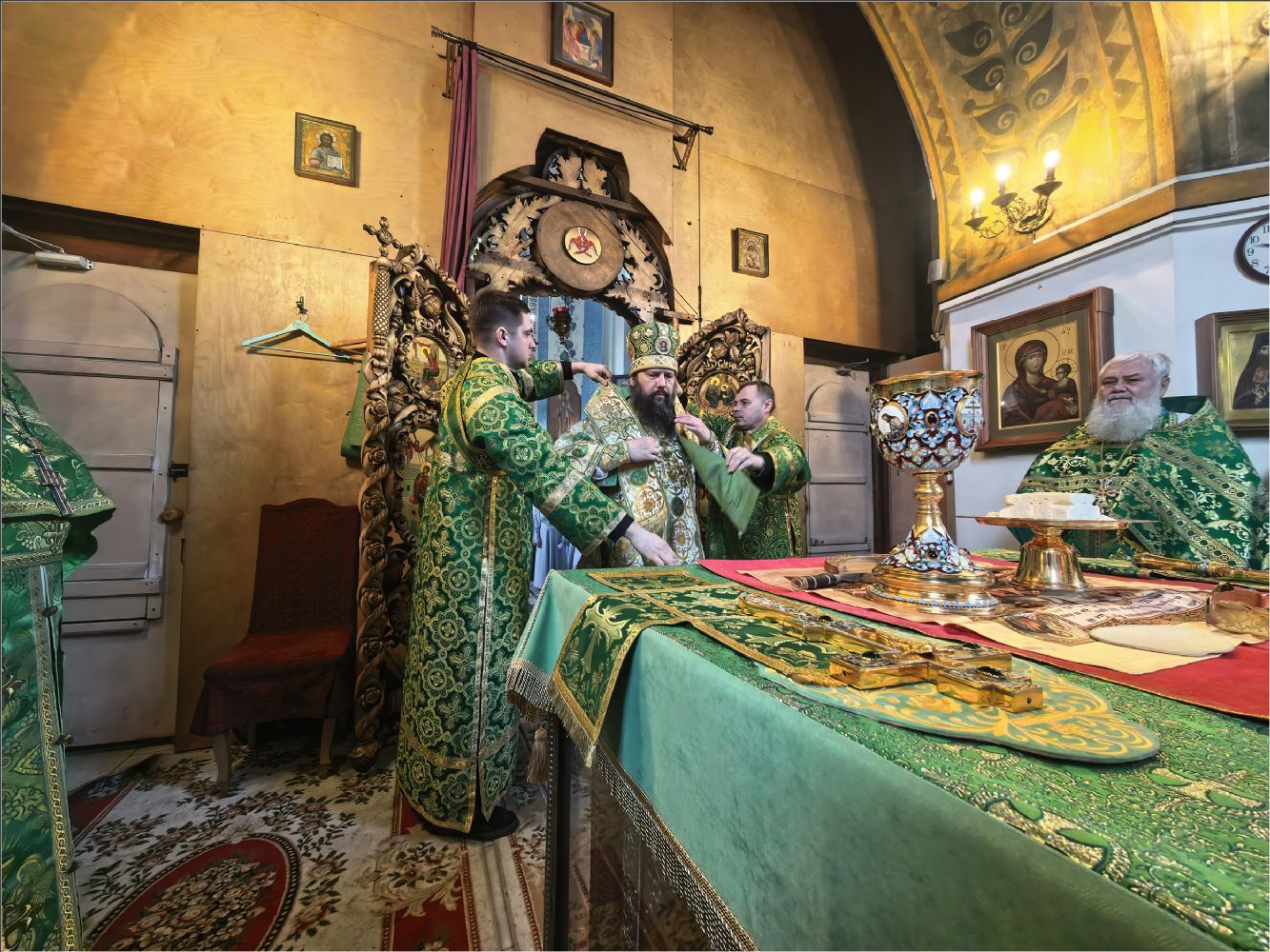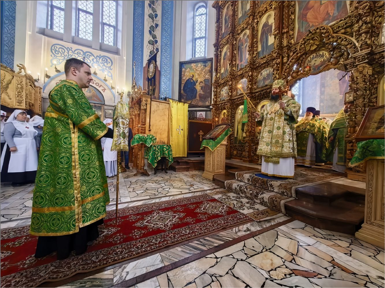 Арипастырю сослужили секретарь Набережночелнинский епархии, духовник Свято-Елизаветского сестричества милосердия, протоиерей Андрей Лосык, благочинный Закамского округа протоиерей Андрей Дубровин, настоятель храма преподобного Серафима Саровского города Набережные Челны, духовник Свято-Серафимовского сестричества милосердия, иеромонах Амвросий (Степанюк), настоятель храма святителя Тихона города Набережные Челны, духовник сестричества имени мученицы варвары Алапаевской, иерей Дионисий Васильев, клирики Свято-Вознесенского кафедрального собора иеромонах Иннокентий (Ручкин), иерей Георгий Опарин и иерей Сергий Иноземцев, клирик храма Казанской иконы Божией Матери иерей Филипп Удовенко. Диаконский чин возглавил протодиакон Дмитрий Половников. Песнопения исполнил архиерейский хор под управлением Натальи Гладышевой.